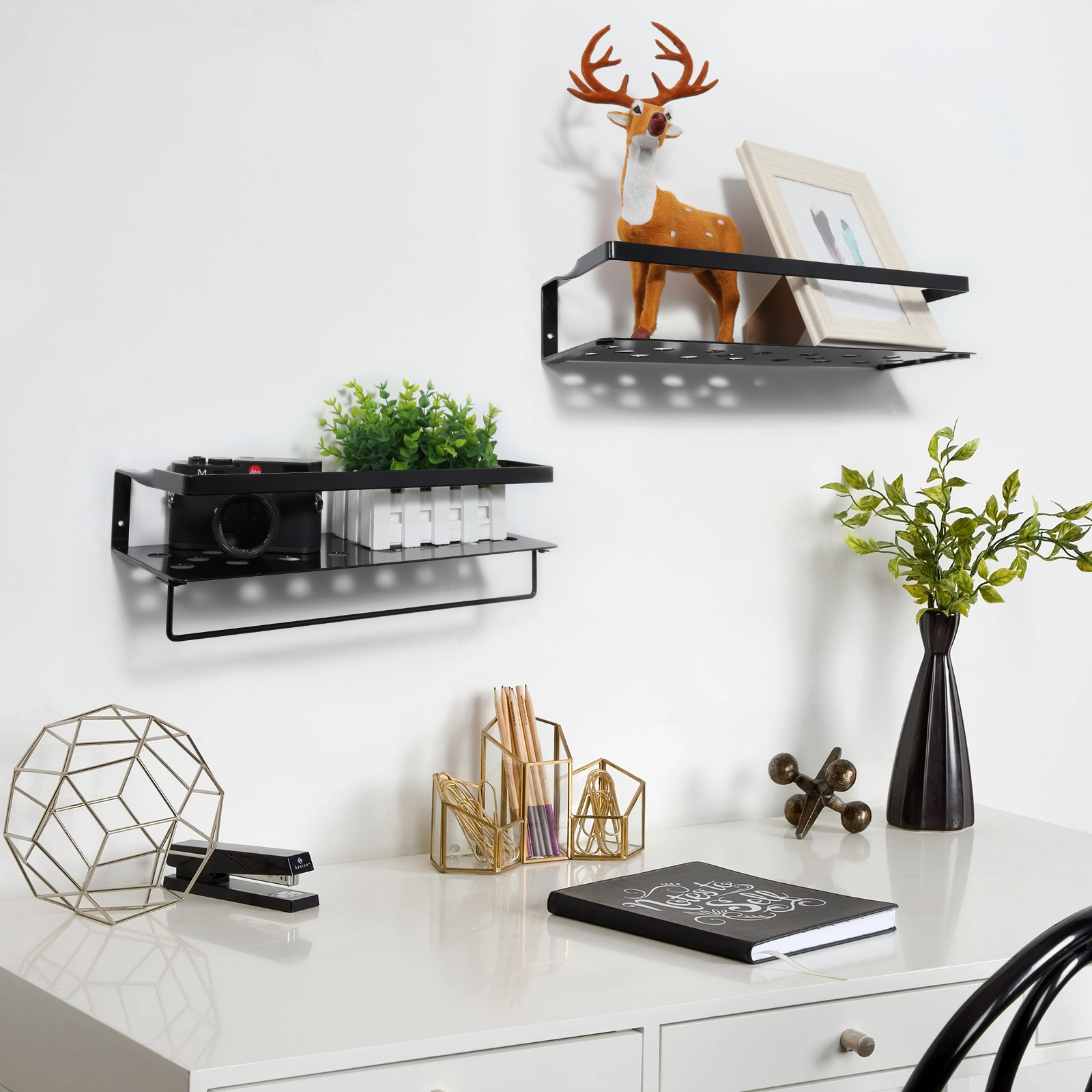 The package includes 2 Iron floating shelves for wall (15.7''L x 5.9''W x 2''H), 1 towel bar, necessary wall screws and shelf accessories, installation instructions manual.