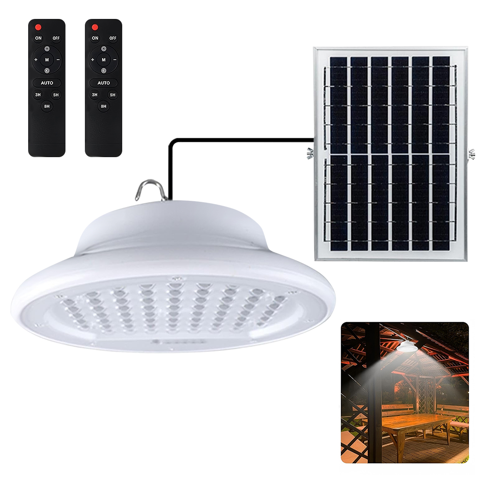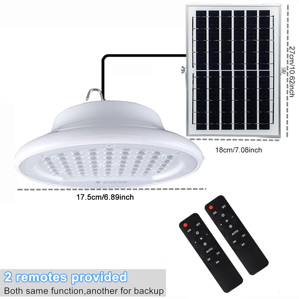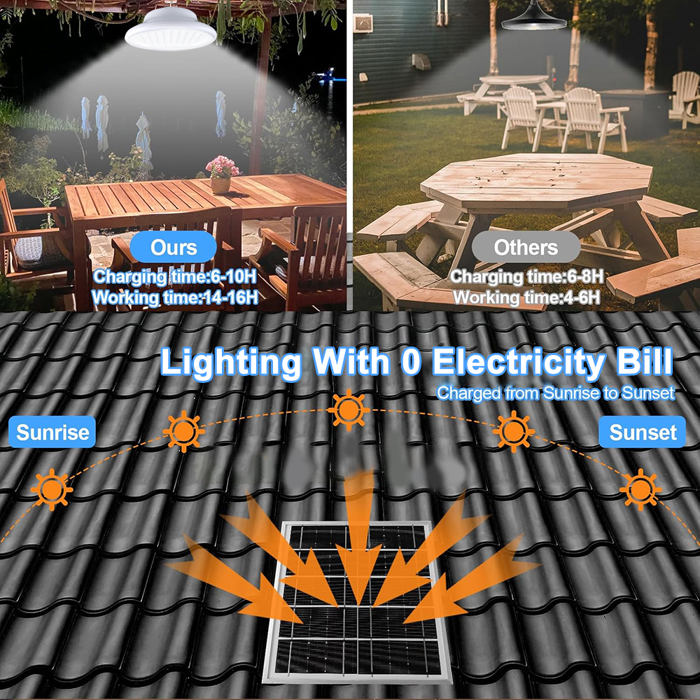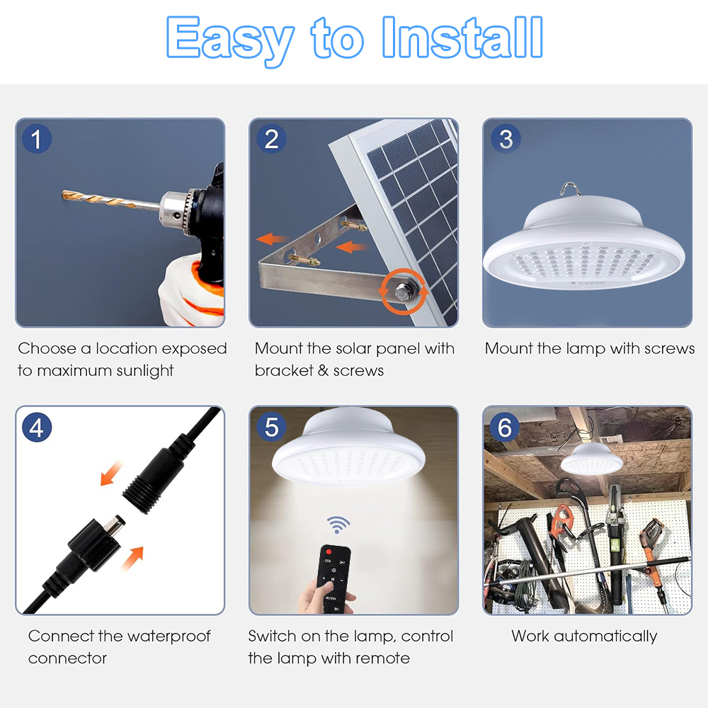 Easy Installation: There hook on the back of the solar light so you can hang the light on ceil where you need lighting easily.It is remote controlled makes you easy to on/off or setting the working modes.The solar panel should be installed outdoor and facing the sun shine directly.
