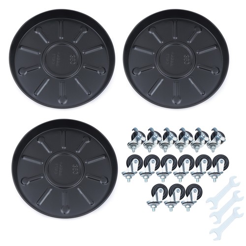 Specifications Product Material: Iron Surface Treatment: Baking Paint Wheels Material: Iron + Rubber Color: Black Specification: 3pcs Each Product Outside Diameter: 36cm/14.17" Each Product Inner Diameter: 34cm/13.38" Each Product Depth: 4cm/1.57" Each Height ( Including Wheels): 10cm/3.94" Package Size: 38*38*12cm/14.96*14.96*4.72" Gross Weight: 4.2kg/9.26 lbs Maximum Load Capacity: 290kg/639.34 lbs Installation Prepare the tray, wrench, and universal wheels. Use the wrench to fix the wheels under the tray. (Install three normal wheels and two brake wheels per tray) After installing all wheels, please test the flatness. Finally, test the braking ability of each wheel and you are done. Package Included 3* Trays 6* Brake Wheels 9* Normal Wheels 3* Wrenches