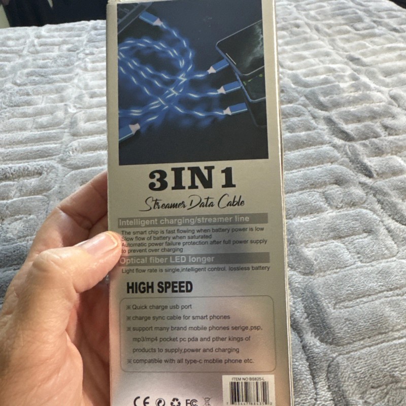 The 3 IN 1 Quick Charger Cable Silver LED Flowing Streamer is a versatile charging and data sync cable designed for various devices. With multiple ports including Lightning, USB-C, and Micro-USB, this cable allows you to charge your devices quickly and efficiently. The silver color, LED feature, and 360 protection make it both stylish and durable. Made of plastic, this cable is flexible, reusable, and anti-fingerprint, providing a convenient and high-quality charging experience. Made in China, this cable is a reliable accessory for your cell phones and accessories.