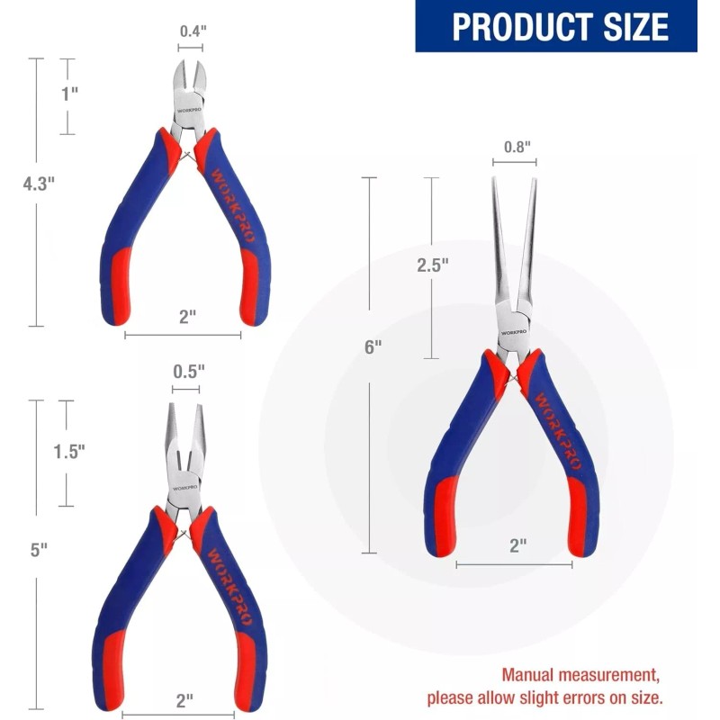 - Includes a 4-inch mini diagonal plier, 5-inch mini long nose plier, and 6-Inch mini needle nose plier.