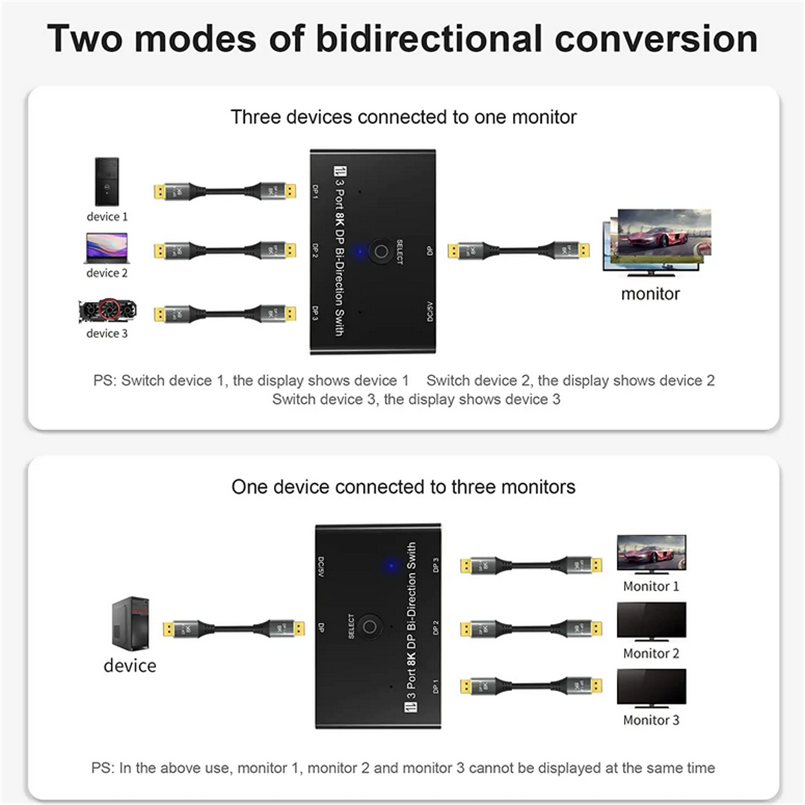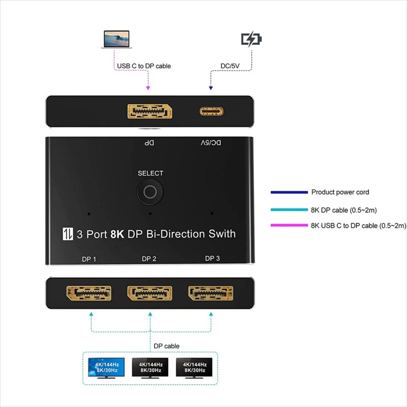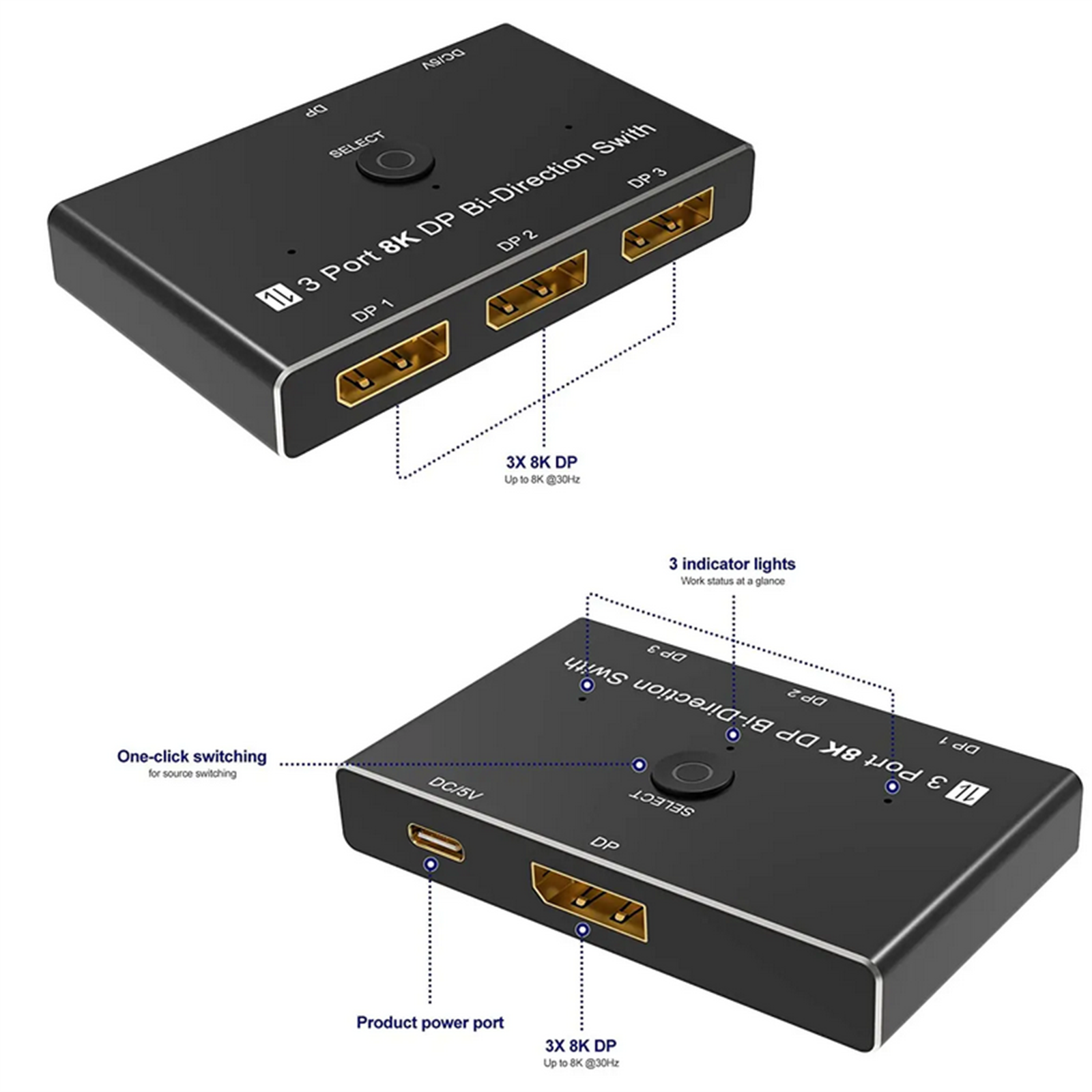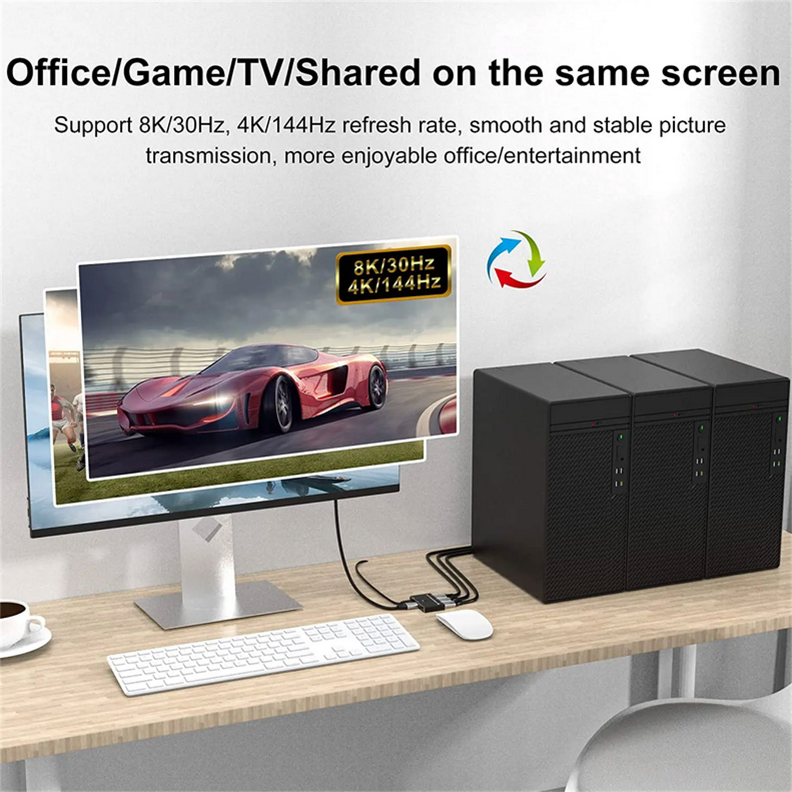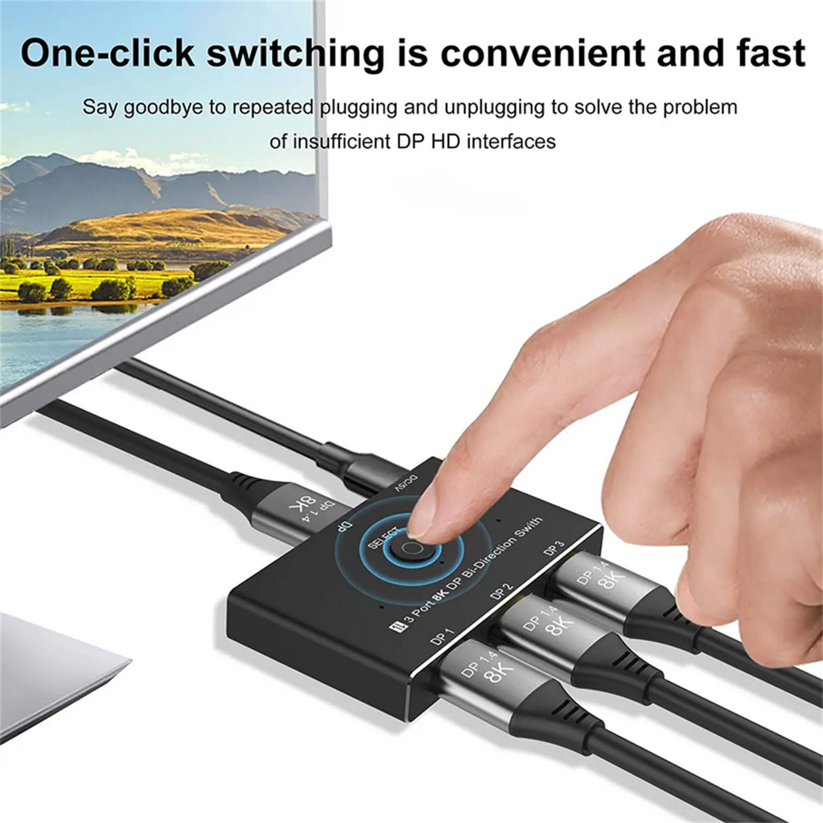 DisplayPort 8K Two-Way DP 1.4 Switch 3 In 1 Out/1 In 3 Out Bi-Direction 8K@30Hz 4K@144Hz Splitter Converter For Multiple Source And Displays