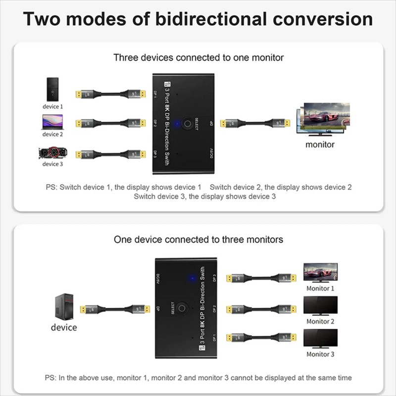 3. Bi-Direction DP Switch:The DisplayPort switcher allow you to connect three DP source to one DP display or connect one DisplayPort source to toggle between three displays. (Three displays CANNOT display simultaneously, Press"Select"button to switch between three displays.) While connecting to Source or Display, you must use the usb cable to power the splitter, or your display can not show anything). Do not use too long cable(total 3m) for connection between the switcher and your devices.