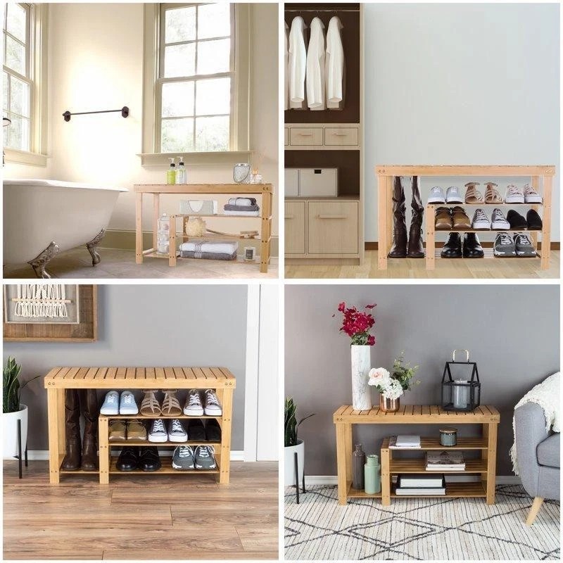 - The Bamboo Shoe Rack and Boot Bench by Lavish Home is the perfect organizational solution for any home! With three tiers of shelving for your shoes and one tier for boots, as well as a bench seat top, this storage rack provides a convenient place to sit and put on your shoes before you head out the door! Constructed from beautiful bamboo, this bench is durable, eco-friendly, and bacteria resistant. It’s a great space saving option for any house, dorm, or apartment and is an excellent option to keep your entryway, hallway, living room, bedroom or bathroom neat and clutter free!