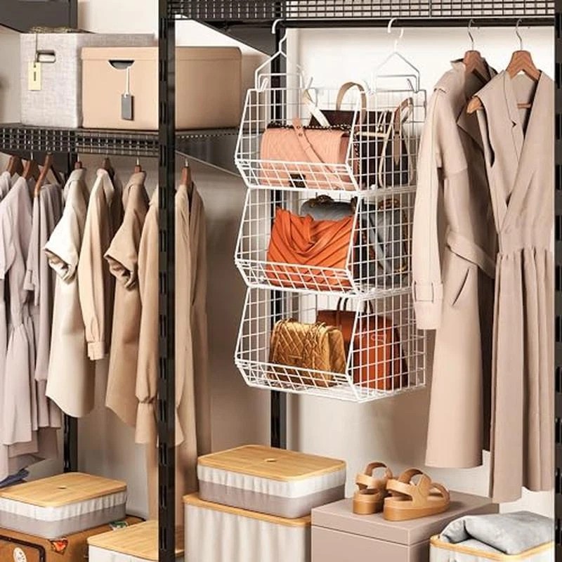 3 in 1 or Use Alone: X-cosrack closet hanging organizer is the layered design, used alone or stacked according to your own need and idea. And you can screw all the three baskets together and hang them as a unit on the closet rod to store clothes, hats, sweaters, jeans, shirts, shoes, purses and other accessories. Also, you can hang 2 baskets on the wall, and place 1 on the shelf. You can DIY the using methods.