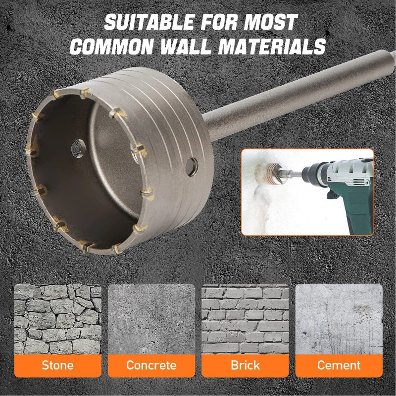 4. Widely Used: Concrete hole saw bit makes it easy to drill through the most common wall materials such as cement, brick, concrete and stone. Widely used for drilling wall or installing pipes, water pipes, exhaust hoses, etc.