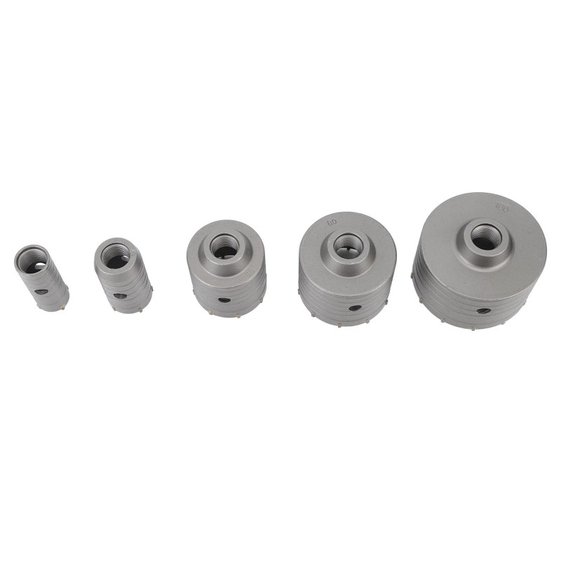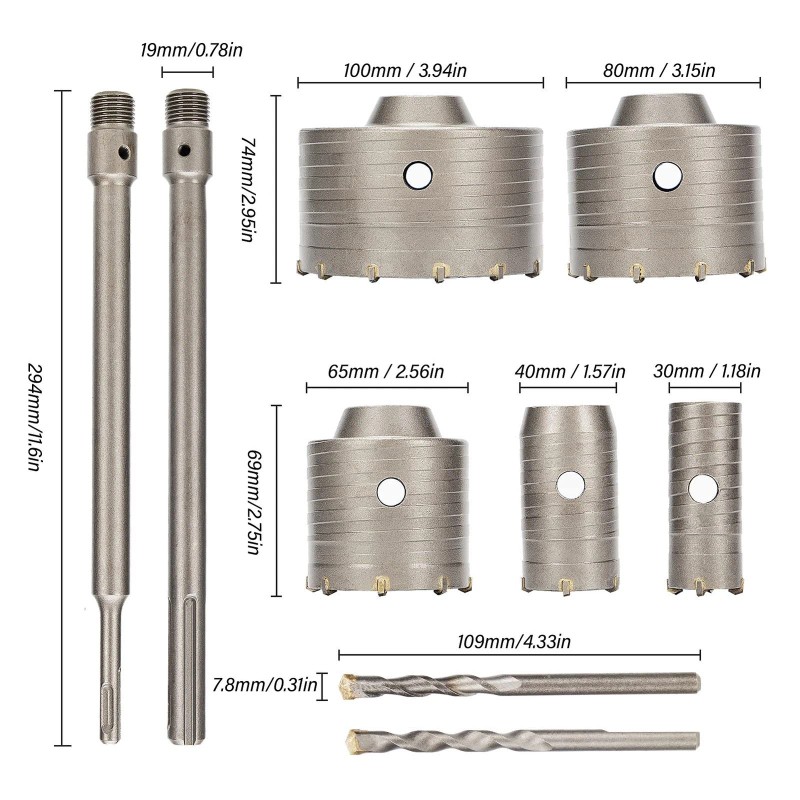 1. 5 Diameter Hole Saw Bit: This concrete hole saw bit kit has 5 diameter hole saw bit, 30mm or 1.18in, 40mm or 1.57in, 65mm or 2.56in, 80mm or 3.15in, 100mm or 3.94in.