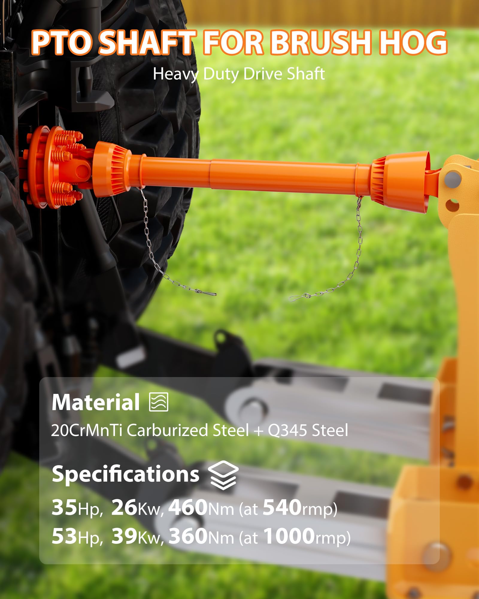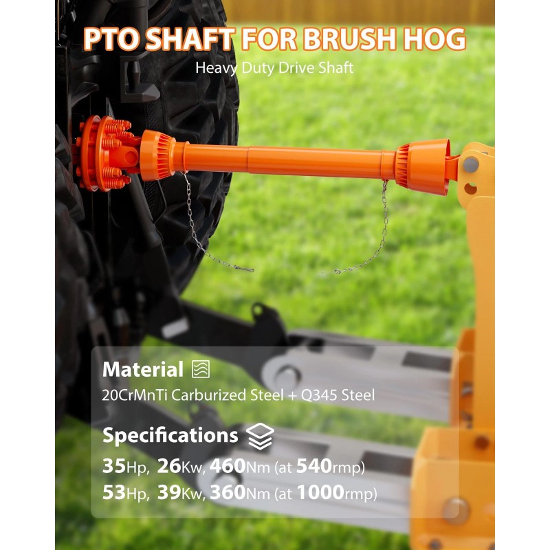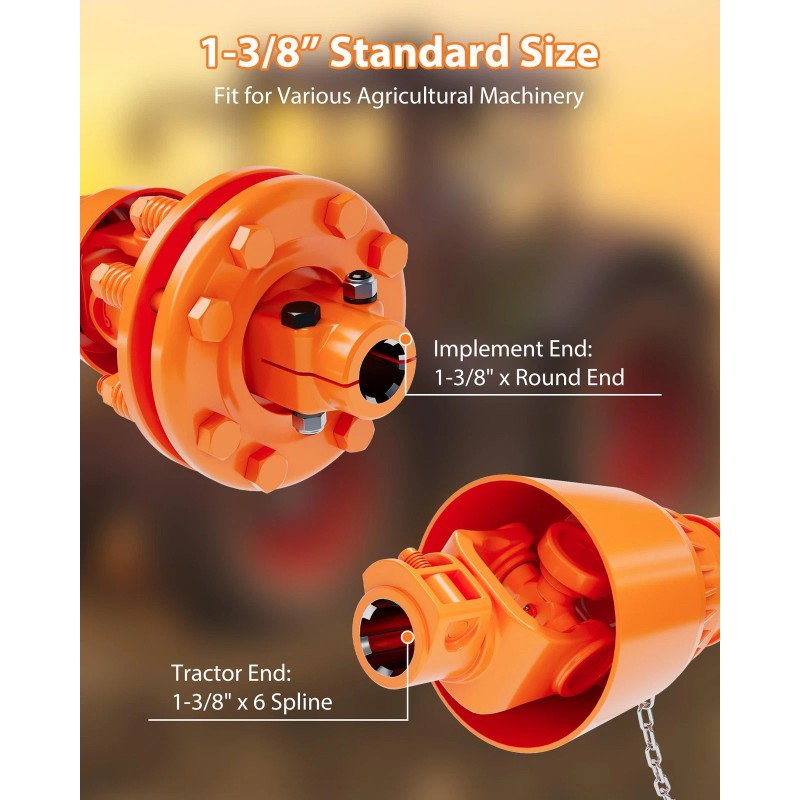 【Universal Compatibility】: Featuring 6 spline ends (1-3/8" x 6 Spline on both tractor and implement ends), our brush hog PTO shaft seamlessly matches implements and tractors of the same size and type, delivering exceptional driving force for your machinery.