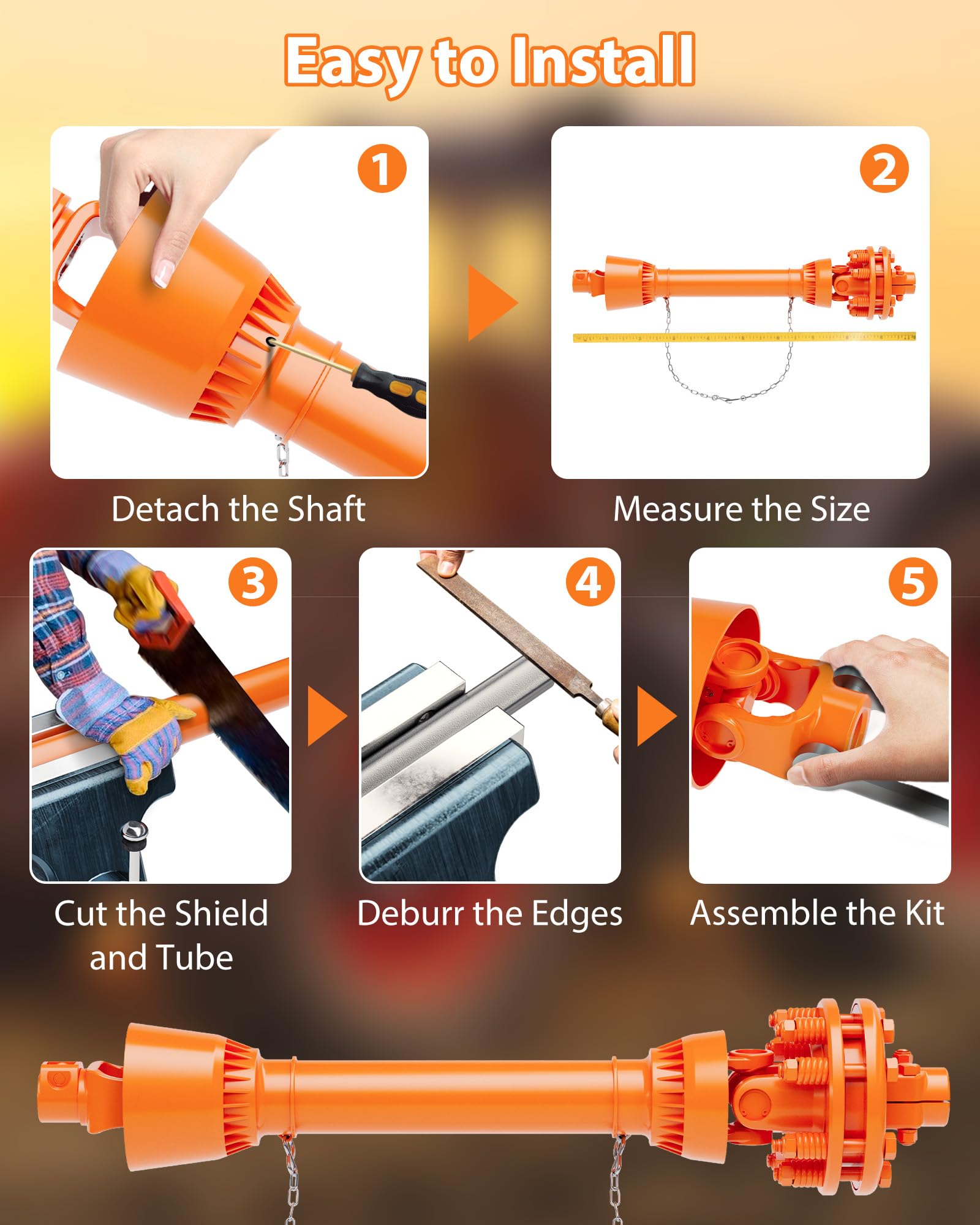 【Effortless Assembly and Enhanced Safety】: Our PTO extender shaft can be easily assembled for direct replacement and features a slip clutch for added security to prevent damage. The inclusion of a security chain and plastic shield eliminates potential transmission hazards, ensuring safe operation.