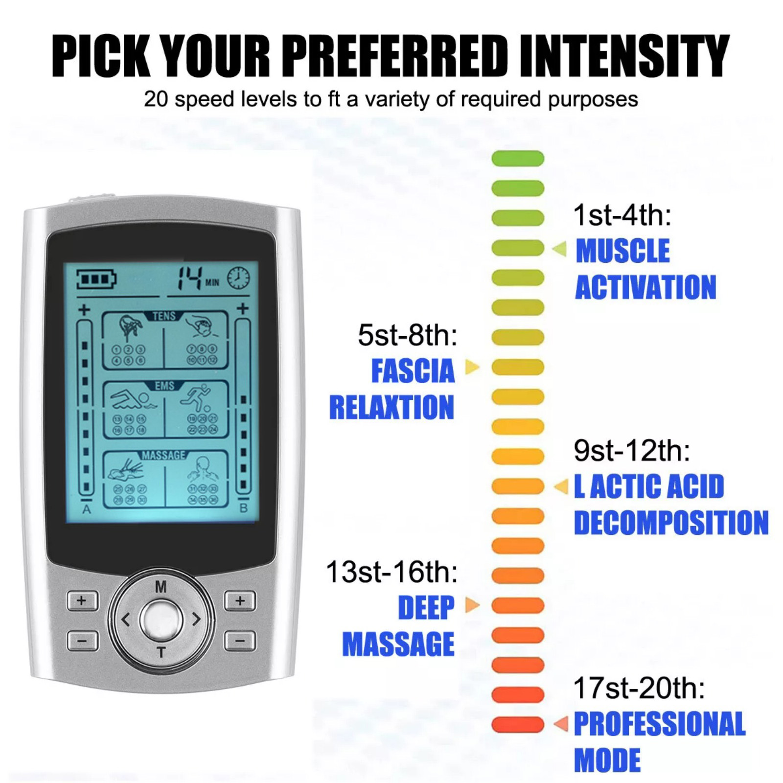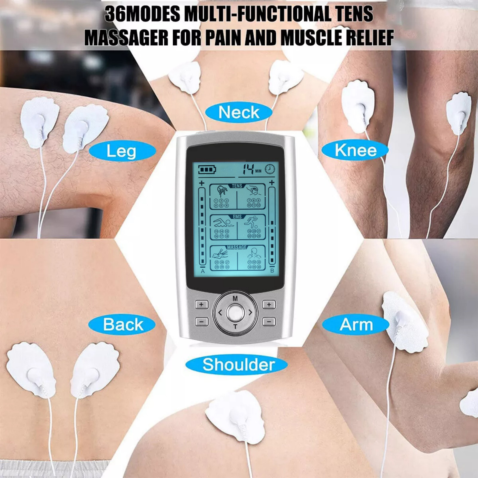 2. 36 Modes & 20 Adjustable Levels: This Tens Unit Is Equipped With 36 Massage Modes (Beat, Massage Therapy, Scraping, Back Massage, Kneading, Acupuncture, Cupping, Neck And Shoulder Massage, Tai Chi), Each Group Has 20 Levels Of Intensity, Allowing You To Easily Find One That Meets Your Needs Settings To Relieve Pain (Lower Back, Arms, Joints).
