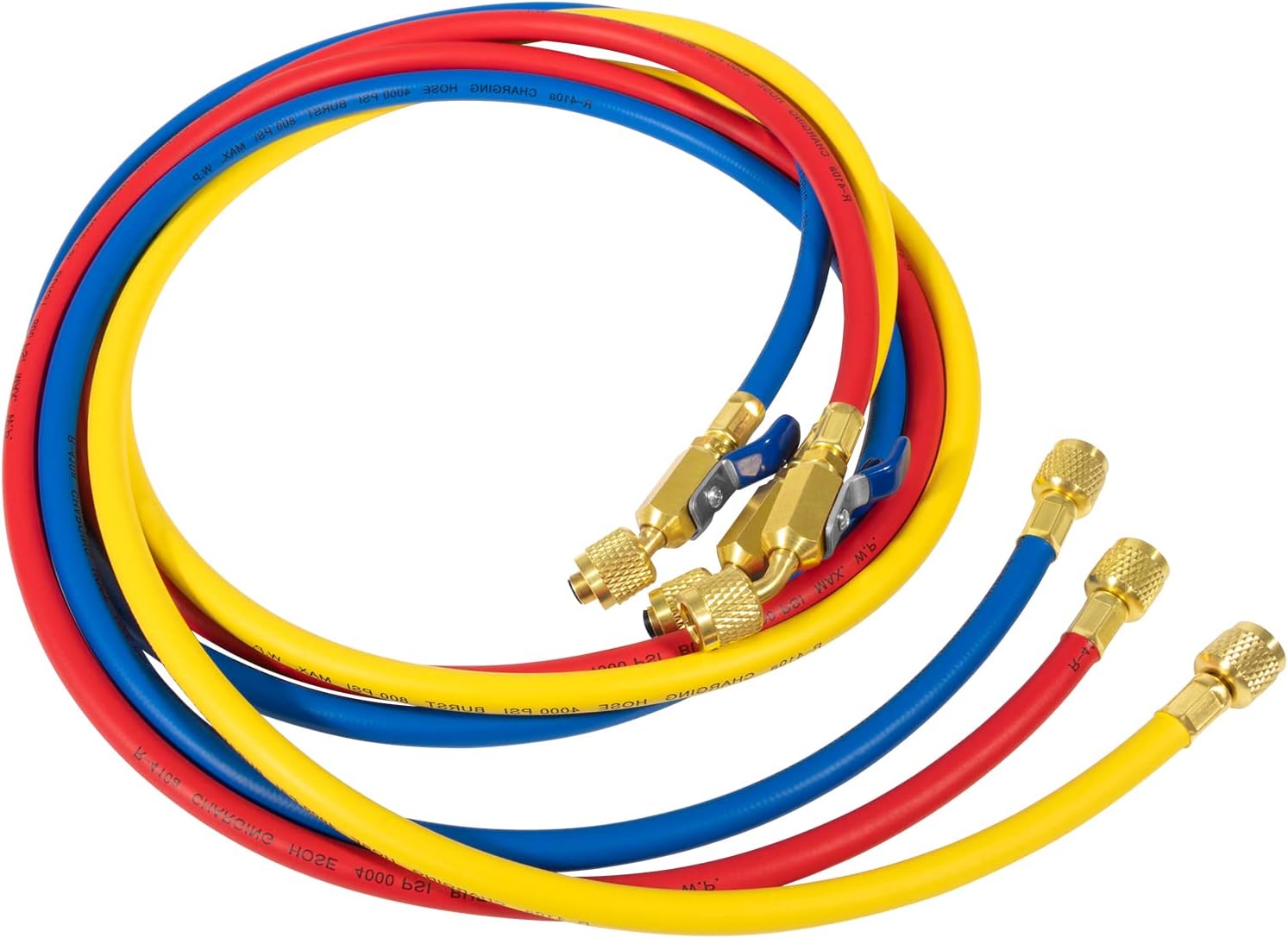1/4 inch Charging Hoses are rated for 800 psi (55 bar) maximum working pressure and 4000 psi (276 bar) minimum burst, operating temperature of -20° to 180°F (-28.8° to 82.2°C) ,minimum bending radius is 6″ (152mm).