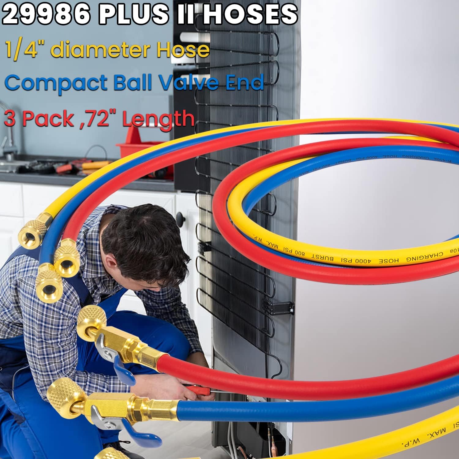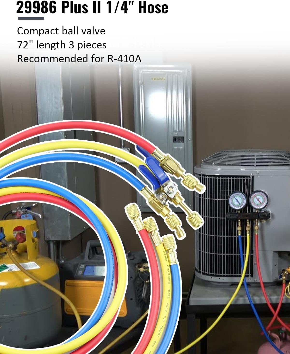 29986 Plus II Hose is a 3 pack (red,blue,yellow) of 72 inch PLUS II 1/4 inch hoses with ball valve, it uses standard gaskets and valve openers. uses a metal handle at end of hose fits tight areas and traps all the gas.