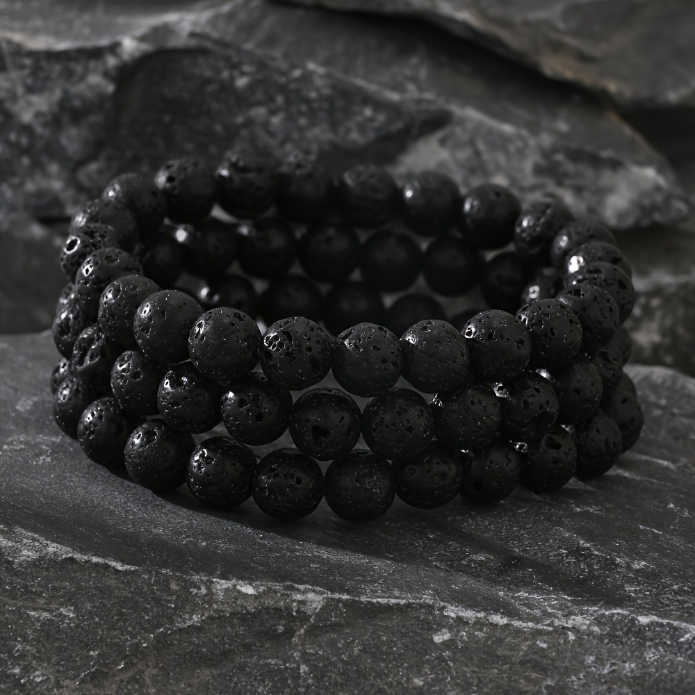 Unbranded 3Pcs Natural Black Stone Bead Bracelets - Elastic Adjustable Fit for Men Women