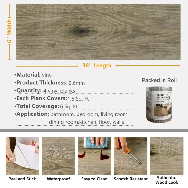 • Feature: Peel and stick floor tile waterproof, strong adhesion, self adhesive, easy to clean and maintain, scratch resistant, wear resistant for high traffic use, removable wood vinyl flooring for residential and commercial use