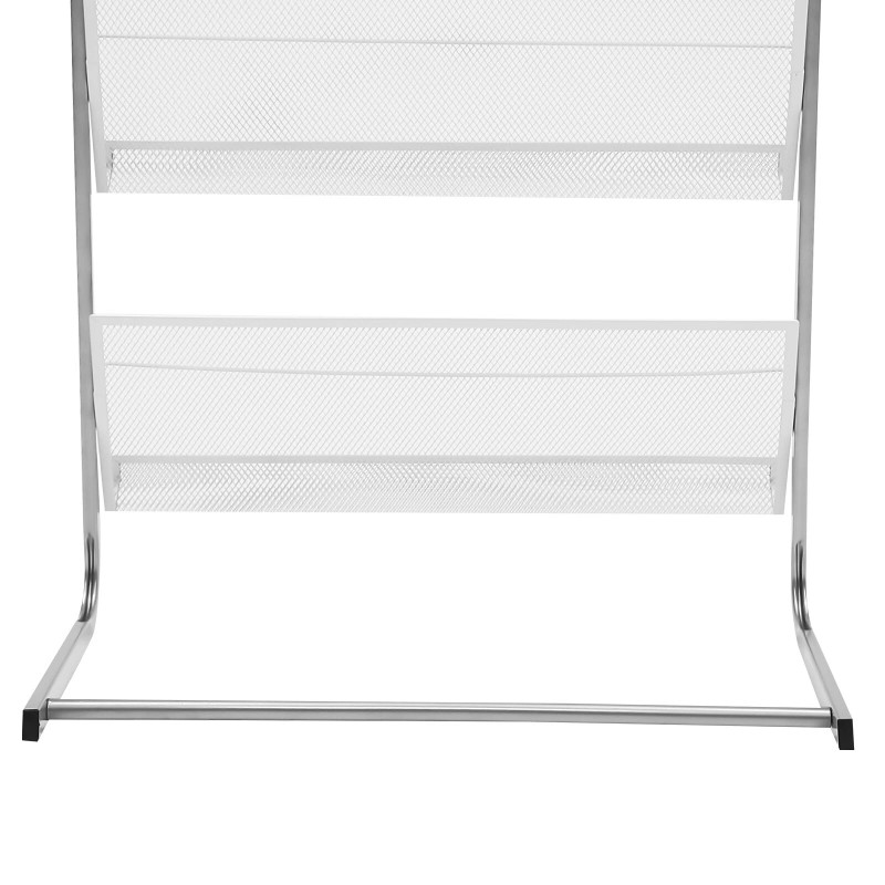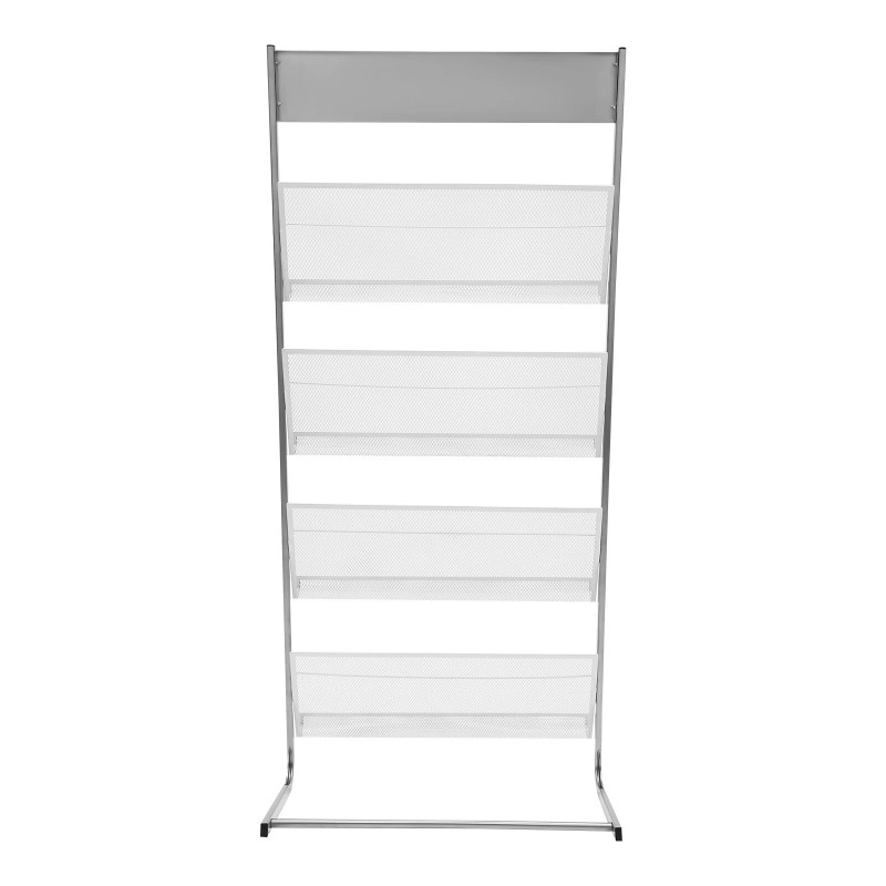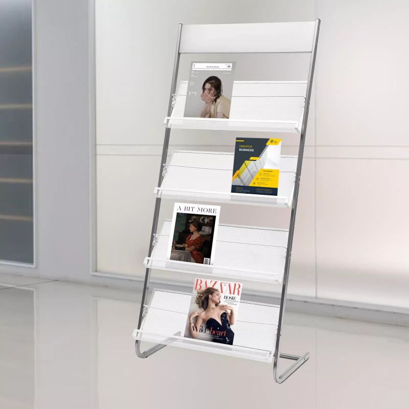 Our floor-standing magazine rack is designed with an inclined design, thus making it easier for customers to select and hold magazines. The anti-fall crossbars and guardrails allow magazines and newspapers to be placed more stably on the mesh basket. In addition, its four-level structure allows you to plan the classification of magazines and newspapers more reasonably and clearly so that you can quickly select your favorite newspapers, magazines, or books.