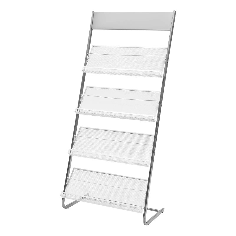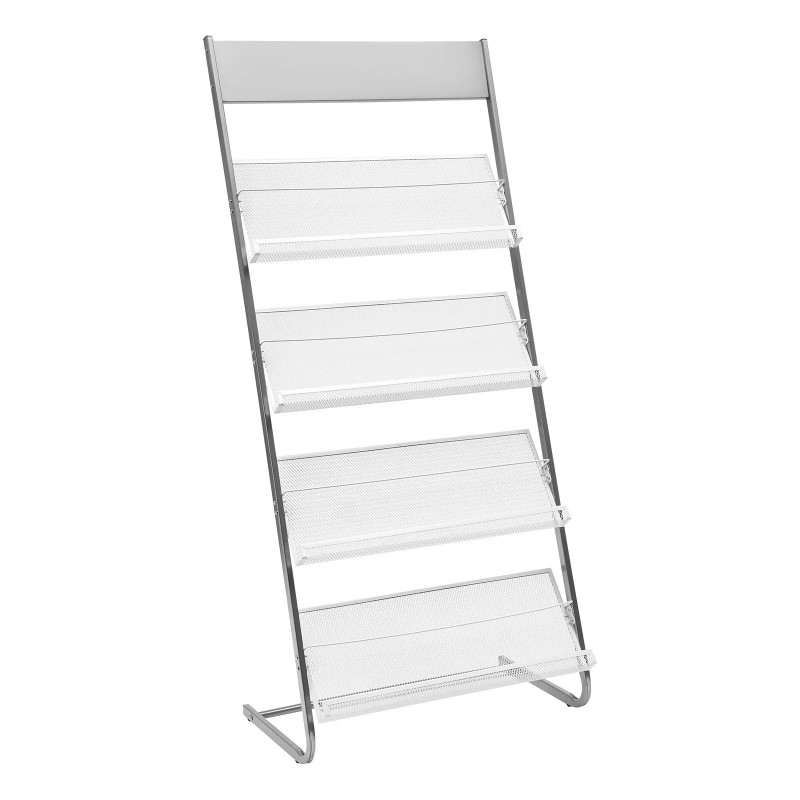Our floor-standing magazine rack is designed with an inclined design, thus making it easier for customers to select and hold magazines. The anti-fall crossbars and guardrails allow magazines and newspapers to be placed more stably on the mesh basket. In addition, its four-level structure allows you to plan the classification of magazines and newspapers more reasonably and clearly so that you can quickly select your favorite newspapers, magazines, or books.