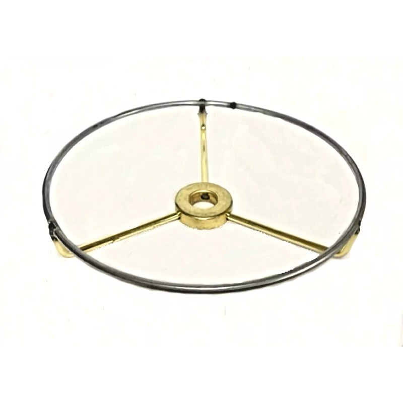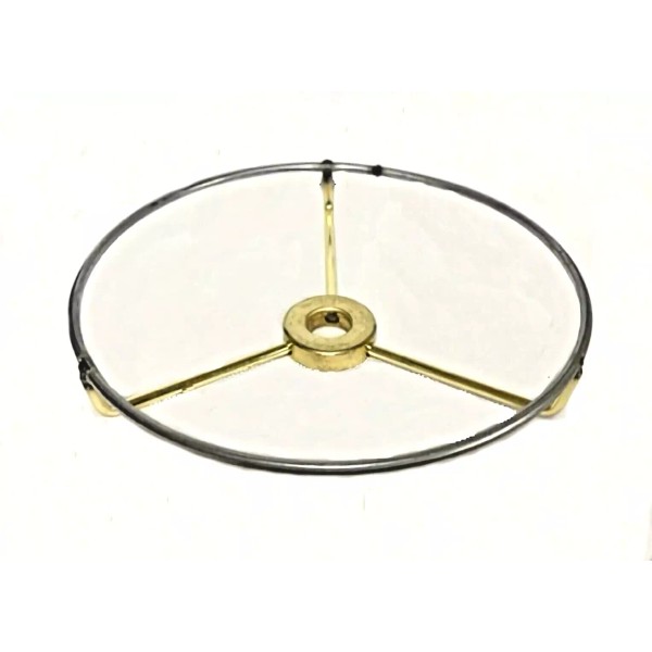 4" brass-plated to make your own lamp shades. Outside ring galvanized silver metal- inside spokes are brass-plated. Inside hole diameter is 7/16"- designed to slip standard 1/8 IPS pipe (3/8" outside diameter).
