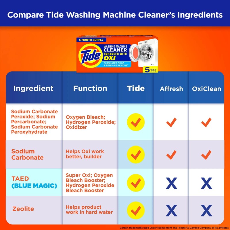 - OXI + TAED FORMULA: Tide Washing Machine Cleaner has the cleaning power of Oxi + TAED, to boost the cleaning action on your washing machine by over 20% .TAED creates a cleaning superboost that works even in hard water which other cleaners can’t do