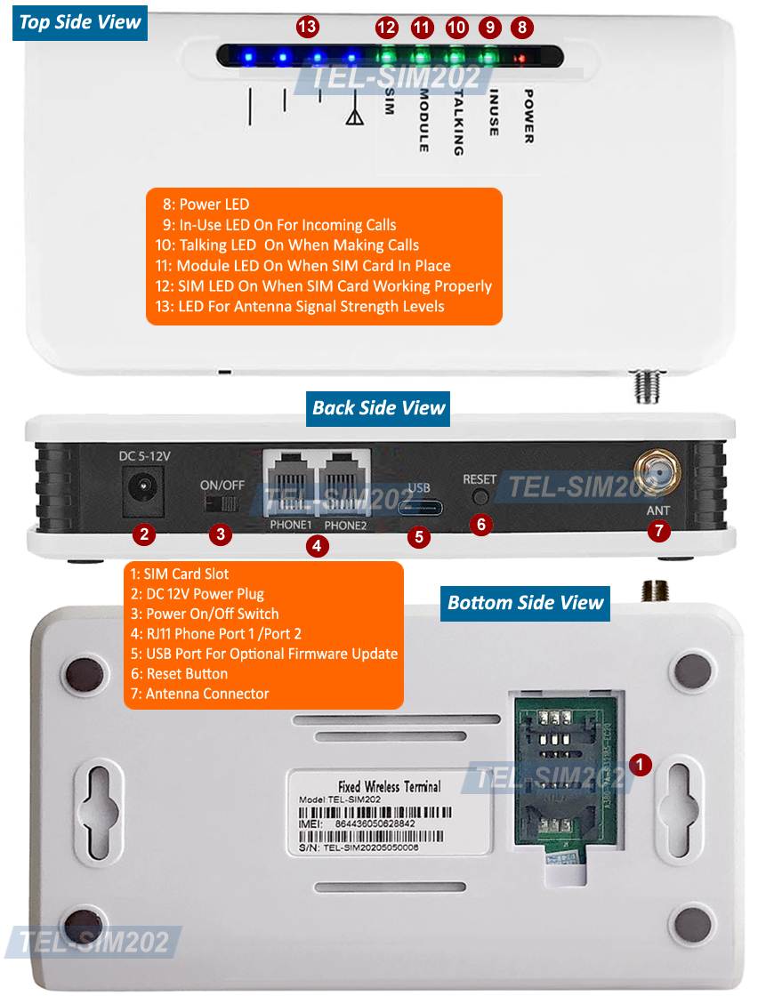 This cellular phone to PSTN landline phone adapter supports telecom carriers using 4G LTE and 3G Tri-Band WCDMA frequency bands including:
