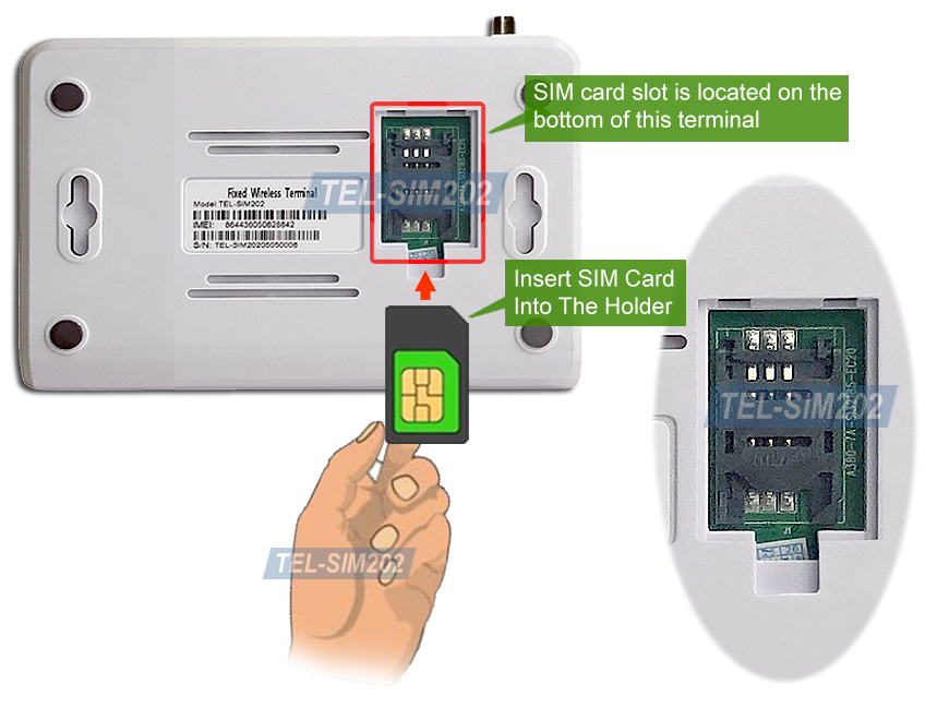 Simply insert an active SIM, mini SIM, nano SIM or micro-SIM card (using SIM adapter) into the SIM slot on the bottom of this unit and then connect with any kind of desk phone.