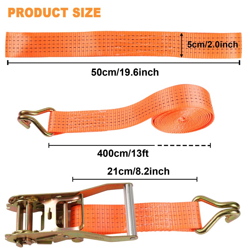 【Easy to Operation】Simply press the lever on the handle of the heavy duty ratchet tie down strap, lift the handle, open the ratchet, then slide the loose end of the strap over the lever on the handle and fold it up, finally insert the end fitting of the double steel J hook into the cargo tie anchor and pull the loose strap tight until it reaches maximum tension