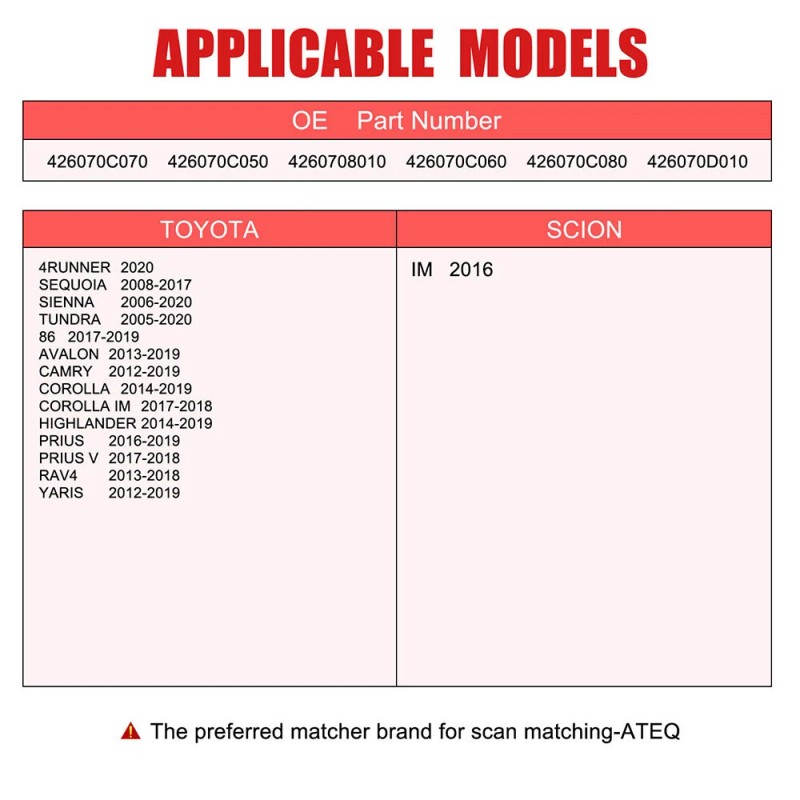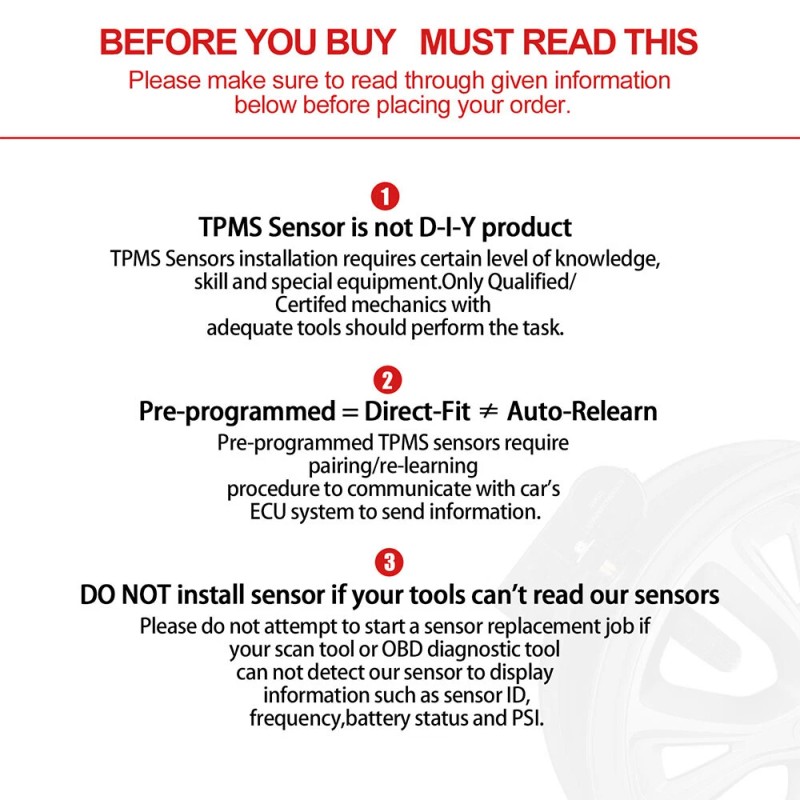 Note1: Pls Use the vehicle fitment we've provided within the body of the listing to confirm vehicle fitment.     Note2:  Vehicles require that tire pressure monitor sensors are installed and properly activated. Must be programmed to vehicle with TPMS Programmer or the relearn process in owners manual. Failure to install and activate sensor will cause tire pressure monitor light to remain on. Sensor operates on a 315MHz frequency. FOR USE ON ALLOY WHEELS ONLY---20 DEGREE PITCH. Simplified Relearn : OBDII required       SPECIFICATION :  Manufacture Part Number :42607-0C070 ALTERNATE PART NUMBERS: 42607-0C050 42607-0C030 42607-08010    Battery Life: ABOUT 5YEAR Operating Frequency: 315MHz Made in USA      PACKAGE CONTENT :    4PCS TPMS SENSOR