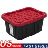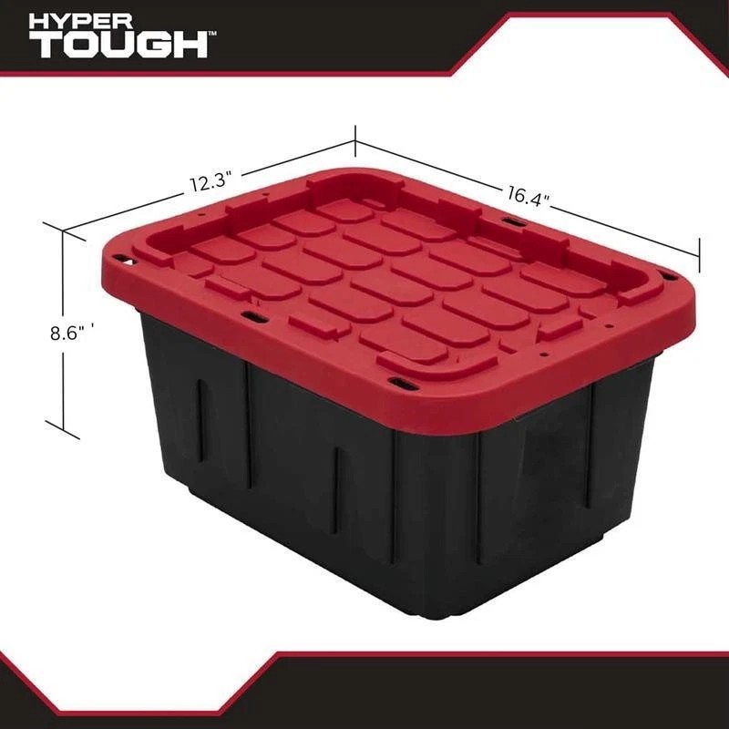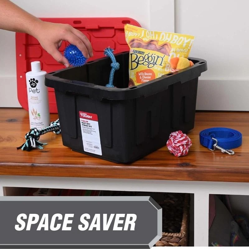 Organize clutter and hide unused items with the 5 gallon snap-lid plastic storage tote.  The small size makes it portable while fitting in smaller spots like cars or under cabinets.  Made of durable rigid polypropylene, the black storage tote allows you to hide away things you do not want to be seen, while the red snap-lid adds a pop of color to your space.  The 2-point snap-lid ensures your items are safely secure during storage or transport, while making it easy to open.  The specially recessed lid allow you to stack multiple totes on top of each other to and avoids toppling while maximize storage space.  Protect your valuables by utilizing the 4 tie-down holes made for zip-ties and padlocks.  The easy to clean material helps keep out pest, dirt, and dust.  The long lasting tote works great in basements, closets, pantries, sheds, barns, and attics.  This tote is great for organizing household products, gardening supplies, pet treats and supplies, shoes, clothing, seasonal gear like boots, sporting equipment such as golf balls, tennis balls, or cones, and many other items.