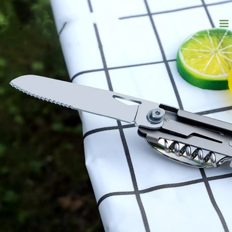 5-in-1 Folding Multi-functional Cutlery: Includes knife, fork, spoon, wine corkscrew and can opener. Outdoor camping portable multifunctional cutlery set saves space, perfect for camping, traveling, office, college school, car, backpacking, picnic, hiking and other occasions to carry.