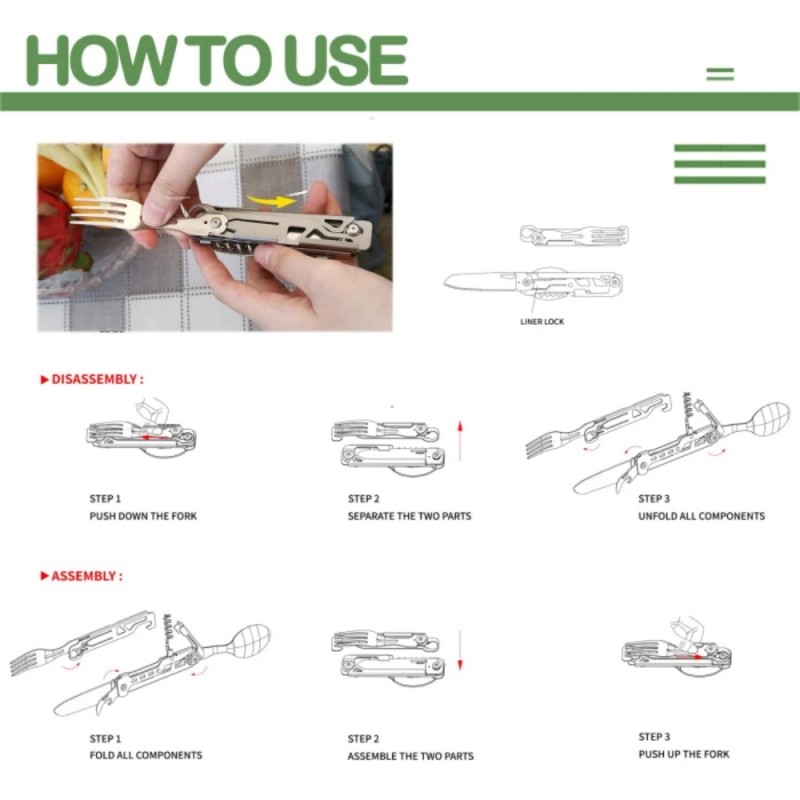 Safe Locking Design: Both the blade and the fork have a locking system for safer use when locked. When closed, simply press the liner lock to fold. When open, it is locked by the liner lock to prevent accidental closure during use, making it safer to use.