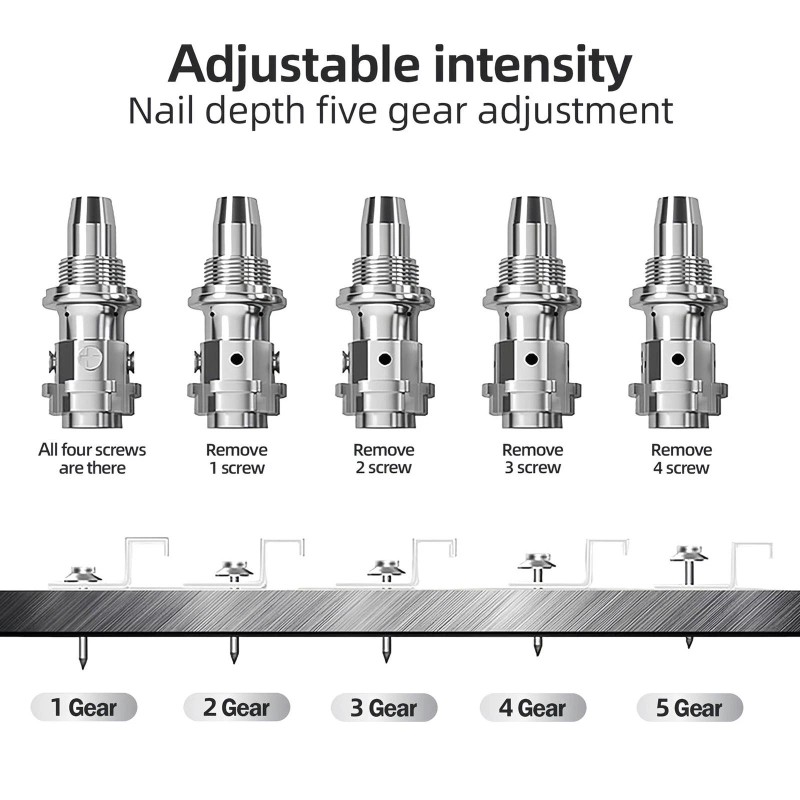 1、5 Power Adjustment: 5 level power control, adjustable to suit different design requirements. The low reducer is suitable for soft surfaces, while the high reducer has high penetration and is suitable for high hardness substrates. 2、Noise Reduction, Easy to Use: Our nailer tool has good sound attenuation. Thickened steel mufflers reduce noise, are safer. It is easy to use, suitable for professional or novice,and make the building environment more comfortable without disturbing family members or neighbors. 3、Lightweight Design: This mini nailer tool is only 33cm in length, caliber 7.3mm and less than 1kg, which can use with 1 hand. Convenient shape, smooth work, easy to carry to different scenes. Thanks to the unique technology, there is no need to carry additional energy or gas bottles, including a power supply. 4、Small Head Design: This steel nail wall fastening tool adopts a small head design of alloy steel, suitable for 16 slots, 20 slots, and row slots. The reinforced and thickened alloy steel firing pin supports the installation of nozzles of different sizes, which makes it suitable for nailing on fixtures of different sizes. The detachable design of the handle ensures that it can be connected to an extension rod. It can be done without climbing. (Extension rod not included) 5、Wide Applications: With strong penetration force, the tool for concrete only takes 0.1s to pierce a 3mm steel plate in one step. Suitable for camera installation, electric box installation, water and power installation, and hanging picture frame, multifunction shelf, small junction box, pipeline installation, wire binding, etc.
