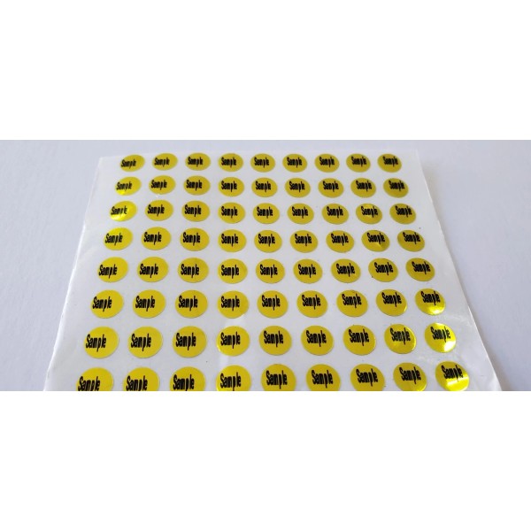 500 pcs circular, custom-printed, tamper-evident, gold-colored security void label stickers.