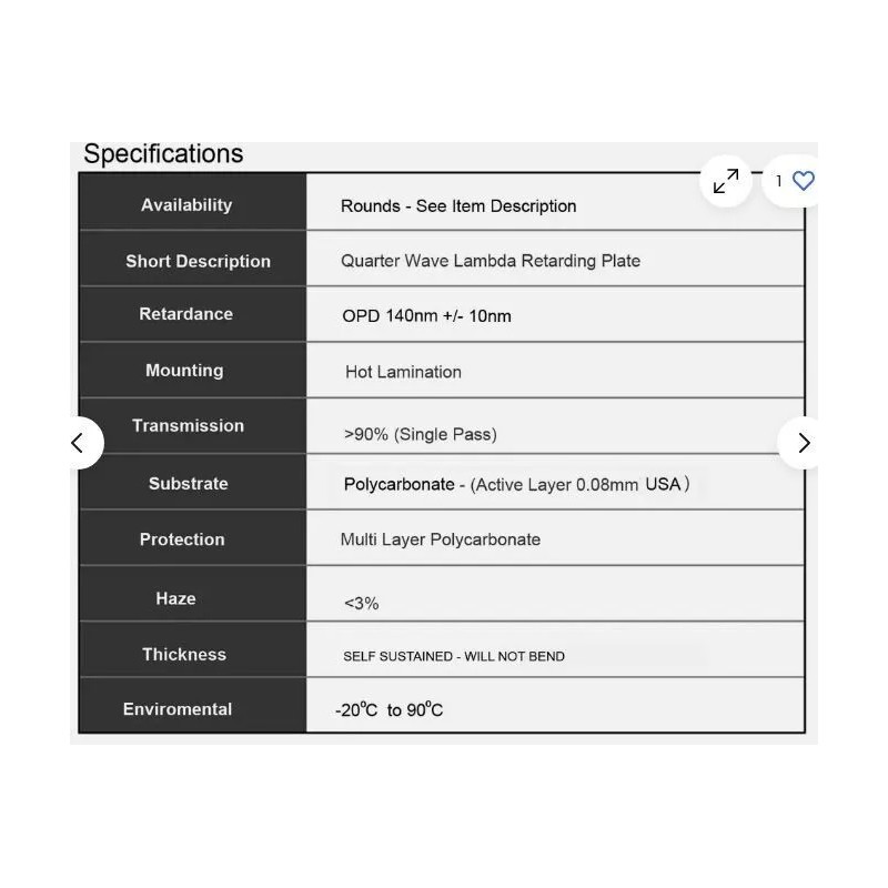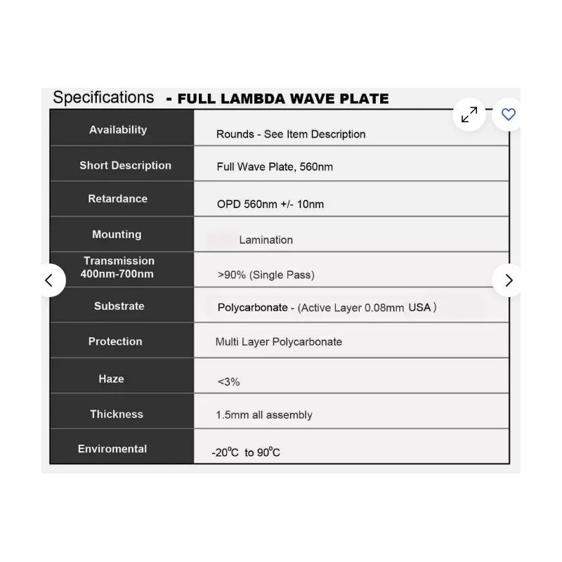 Note: There are in usage two types of Lambda retaining plates: Group one – Laminated and Group two – Glass Mounted no lamination involved. Visual some differences are noticed due to the technology used. Laminated plates are manufactured via hot lamination and at the line of contact between active layer and neutral protection layers there is a micrometric melted layer combining the last two bringing some more colors.. In group two – full Lambda retaining plates – the effect is reversed but less noticeable. Manufacturing price for laminated plates is much lower since large sheets are cut via multiple spindle micro mills or laser cutters. One of disadvantages of laminated plates is a not very even color repartition under a certain angle but their very low price is keeping them in the competition.(For laser applications and special scientific research glass mounted (no lamination involved) retaining plates - glass plus active layer are usually the chosen choice.) Our specs are showing features of the active layer only.