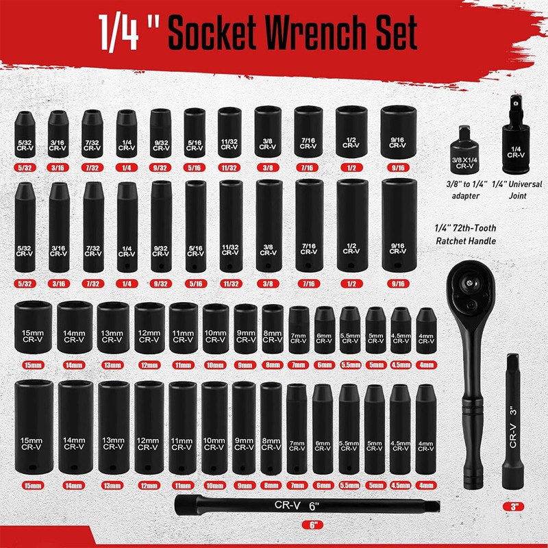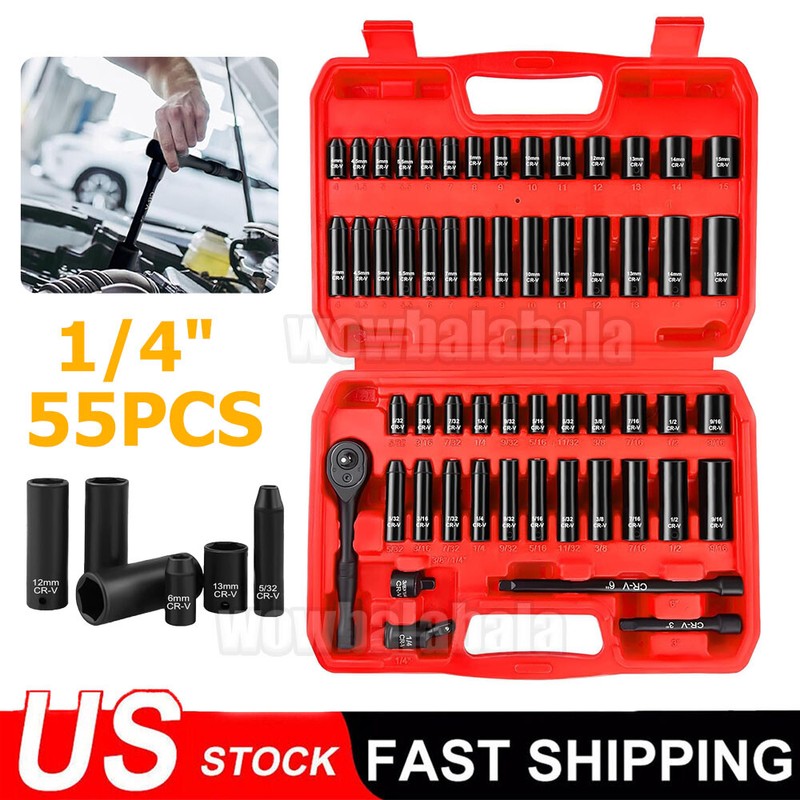 Unbranded 55PCS 1/4" Drive Impact Socket Set Metric & SAE Sockets Shallow & Deep Cr-V