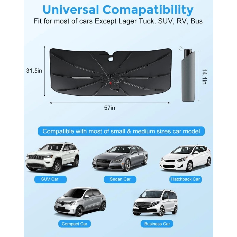 - [Universal Compatibility] - Wider compatibility. Compatible with sedans, SUVs, MPVs, trucks & passenger cars. Featuring 10 high-strength and strong-toughness ribs, achieving 95-120% coverage. Even if your car is slightly larger, it can still be used normally, making this umbrella car shade fit for 93% car models and sizes.