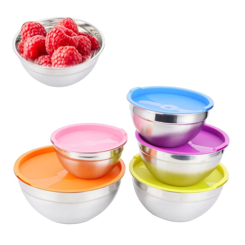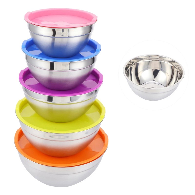 1、Made of high?quality food?grade stainless steel, premium PP lid, non?toxic, odorless, safe and durable. 2、The interior of the polished mirror finish will keep the lasting and lasting, smooth surface without burrs. 3、Because of the deepened design, there is no need to worry about water splashing when playing eggs and stirring, the curved bottom is smooth, and there is no dead angle when cleaning. 4、Wide range of uses, 5 different sizes, very suitable for storage bowls, fruit bowls, popcorn bowls, salad bowls, serving bowls, ingredient bowls, etc. 5、Perfect kitchenware, very suitable for daily use on the family dining table, adds to your kitchen.