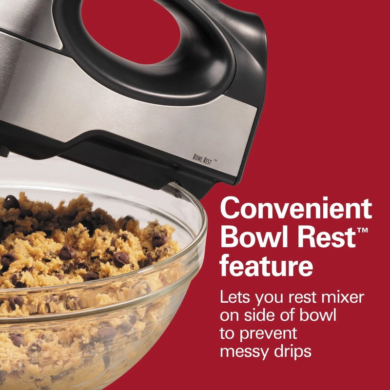 CONVENIENT BOWL REST FEATURE: When you need a free hand to add ingredients, the Bowl Rest™ feature lets you rest the electric hand mixer on the side of the bowl, so messy drips stay off your countertop.