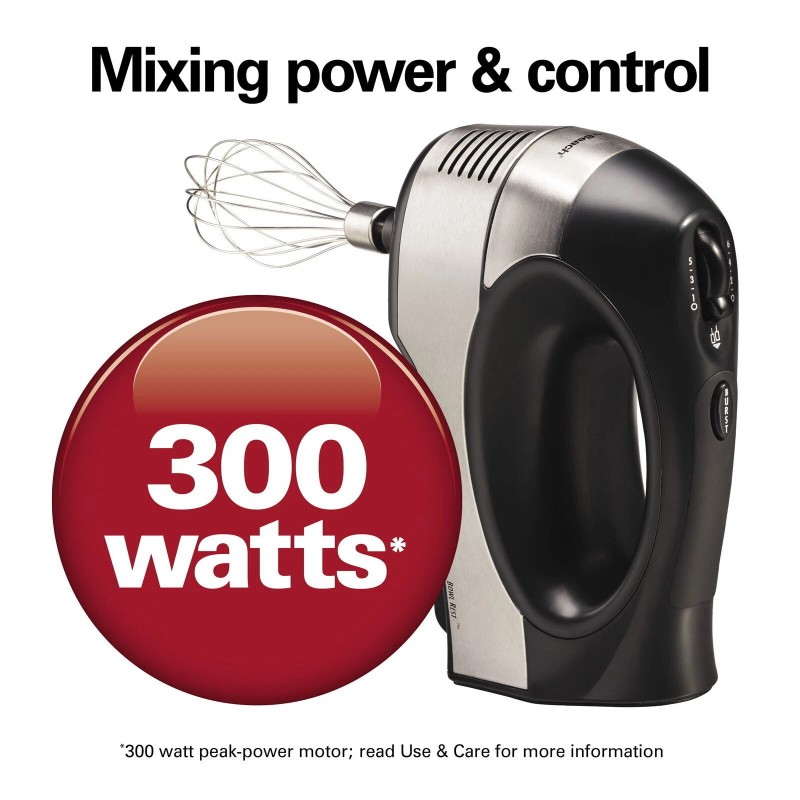 MIXING POWER AND CONTROL: Power through all your mixing tasks with the 300 watt peak-power* motor of the hand mixer and enjoy the comfort and control of its rubber grip handle. *300 watt peak-power motor; read Use & Care for more information.
