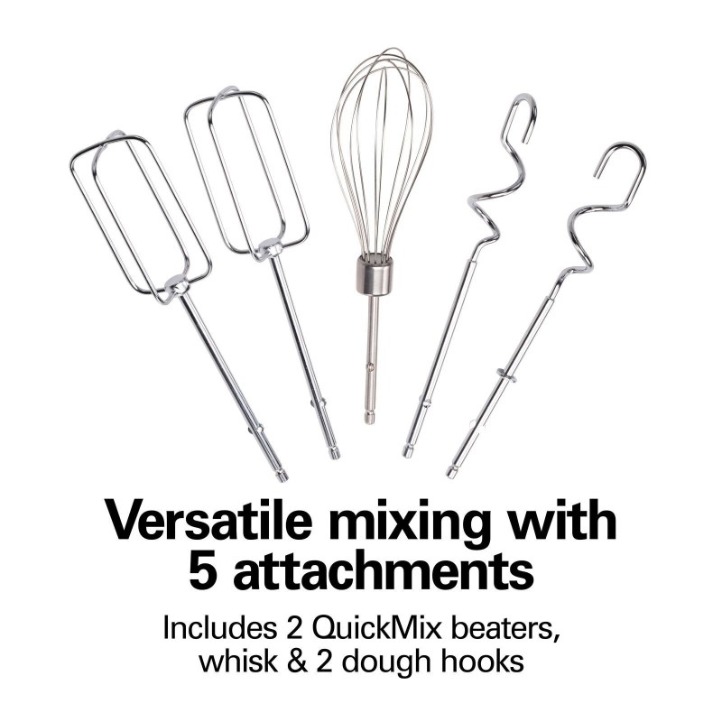 VERSATILE MIXING WITH 5 ATTACHMENTS: You have all the right tools for mixing, folding, beating, whipping and kneading with the included 2 QuickMix beaters, whisk and 2 dough hooks, and they're dishwasher safe for easy cleanup.