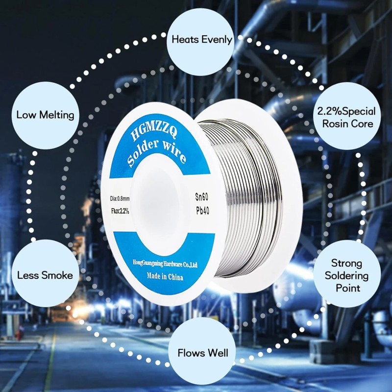 < ul >< li > 1 . Tin Lead Solder Wire : High Quality Rosin Core Solder Wire < li > 2 . Sn / pb : 60 %/ 40 %; Flux : 2 . 2 %; Diameter 0 . 8 mm / 0 . 031 inch < li > 3 . Lower Melting Point : 361F / 183C . easy to be soldered , flows smoothly , soldering fast and strong soldering point .< li > 4 . Pretty good flow , melts evenly and clean , less smoke , Solder joints reliable and beautiful < li > 5 . The applicable scope : household appliances , stereos , headset , toys , circuit board maintenance etc .< br >< div > < p > < span >◆ Product Name : solder wire ◆ Brand : HGMZZQ ◆ Alloy : Tin 60 % Pb 40 % ◆ The flux : 2 . 2 % ◆ The wire diameter : 0 . 8mm ( 0 . 031inches ) ◆ The volume size : 2 . 2 x 2 . 2 x 0 . 62 inches ◆ package : 1pc x 0 . 8mm 50g of solder wire spool ◆ Solder is widely used in the electronics industry , home appliance manufacturing , automobile manufacturing , DIY and routine ◆