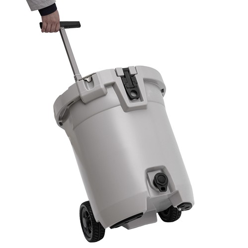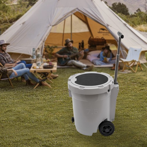 The 7.5-gallon water jug cooler can be used for a variety of occasions such as outdoor fishing, camping, and parties. The food-grade PE keeps food fresh and healthy. Two wheels and a trolley rod allow for easy moving. Used with ice and ice packs (not included), it can maintain insulation for 5-7 days, making it ideal for outdoor travel and medical use.