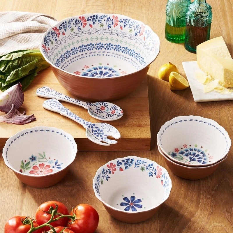 Hattie 7-Piece Bamboo Melamine Salad Bowl Set, Multicolor