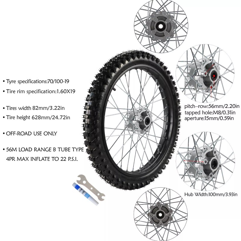 The assembly comes with the 1.6*19 rim, 70/100-19" knobby tire, inner tube, wheel bearing.