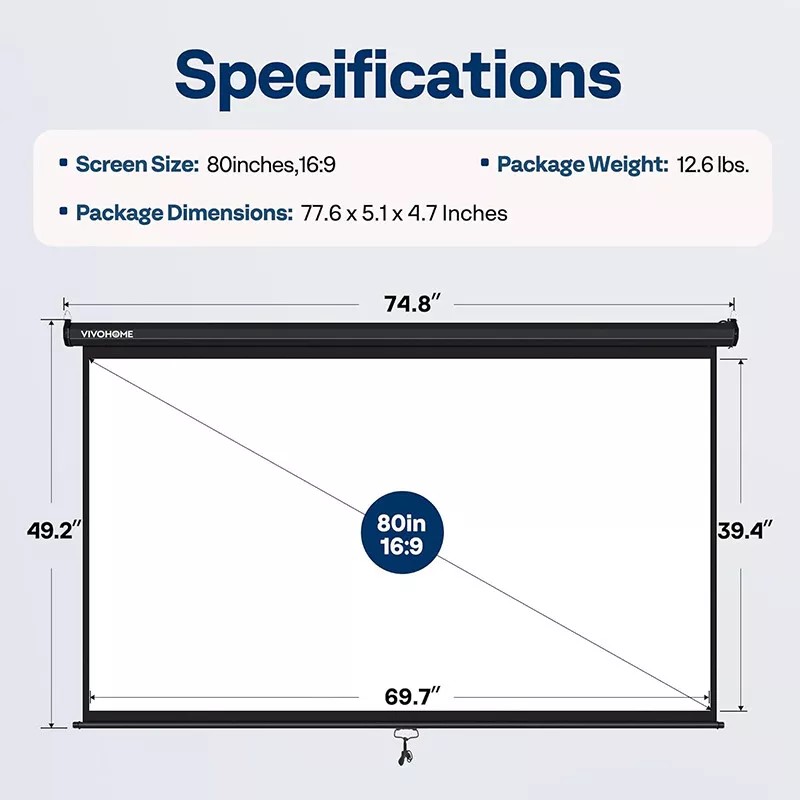 | Diagonal: 80" | Package Include: 1 x projector screen + 1 x Instruction Manuel |