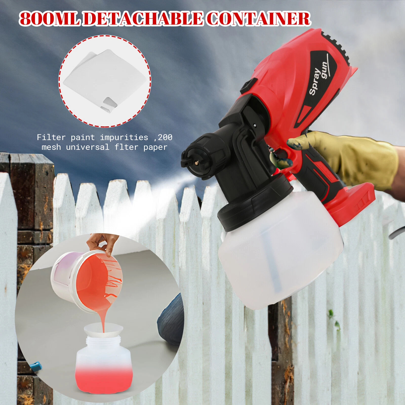 [Advanced technology and design] The paint spray gun adopts a large container of 800 ml, which is more efficient. When the maximum viscosity is upgraded to 120Din-s, the spraying effect is also greatly improved, and a smooth and superior paint surface can be painted. The output of coating quantity can be controlled by adjusting the flow control knob, which is suitable for different projects and can be sprayed where the roller can't reach.