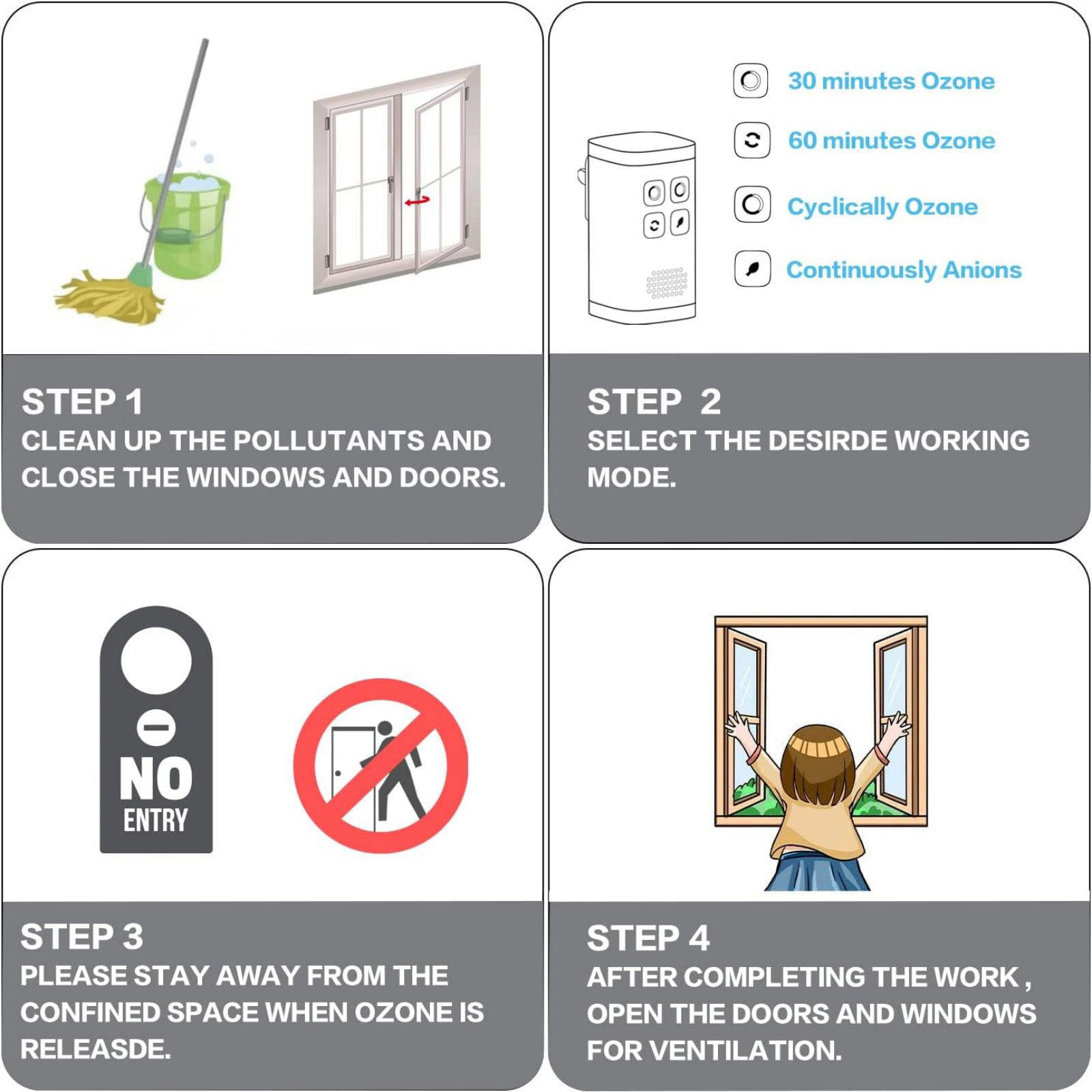 3. Multiple Working Modes: You Can Easily Select Four Working Modes By Pressing The Button Directly Including Ozone Short Time Operation, Cyclic Operation, Continuous Negative Ion Release, Etc.