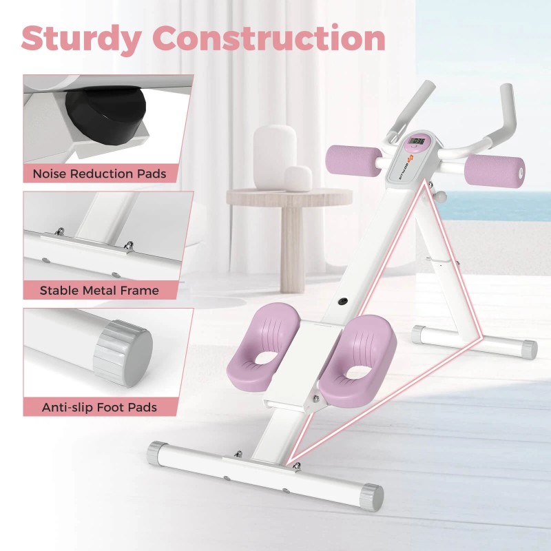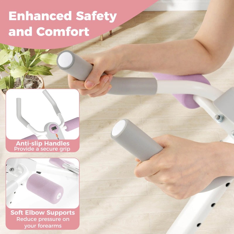 This core strength training equipment features a robust metal frame and anti-slip foot pads, ensuring stable and safe use. With soft padded fillings, this ab crunch machine offers unparalleled comfort for your elbows and knees, enabling a diverse range of full-body exercises. The adjustable design allows users to set the machine to 2 incline angles and 5 different heights, catering to all fitness levels. Additionally, the LCD monitor provides real-time feedback on your workout statistics, including time, calorie, count and total count, keeping you motivated and informed throughout your fitness journey. For added convenience, it’s crafted to fold easily and includes a lock pin to prevent accidental unfolding, optimizing your living space.