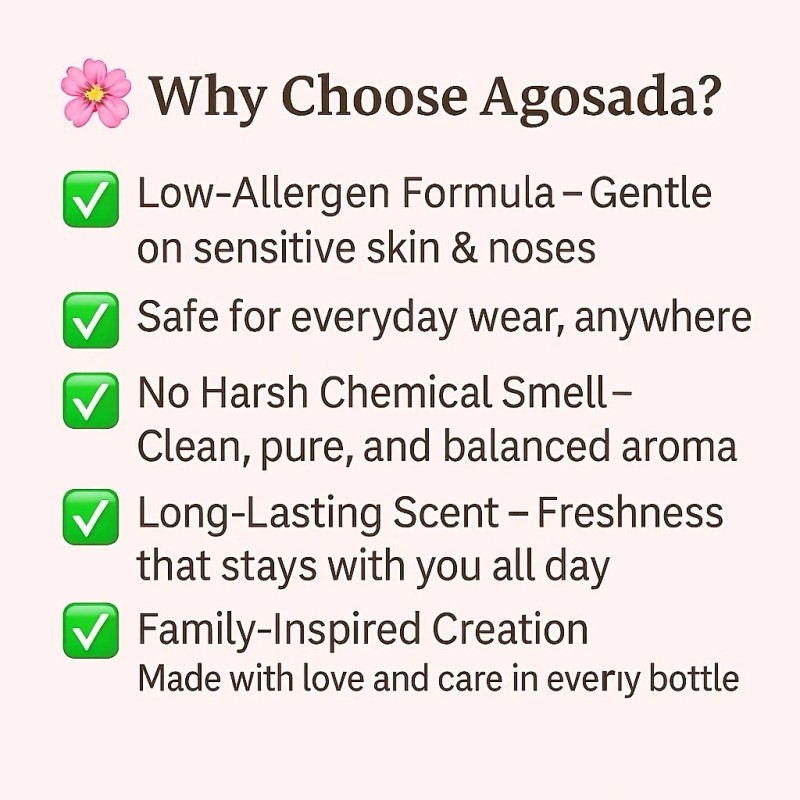The Water Lotus variant evokes a sense of calm and renewal—like a gentle morning breeze over a serene pond. Its delicate floral freshness blends with a soft aquatic touch, symbolizing purity, hope, and the beauty of life’s simple moments. Carry the warmth of family and the purity of the lotus wherever you go—with Agosada Water Lotus.