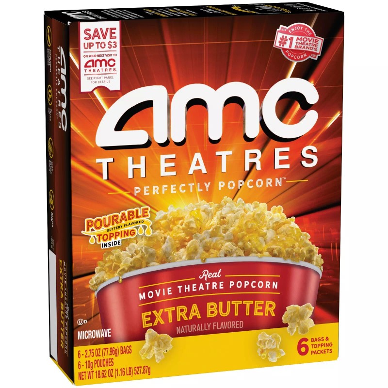 • Contains (6) 2.75 oz. bags of AMC Theatres Microwave Popcorn, Extra Butter. Also includes (6) 10g buttery topping packets
