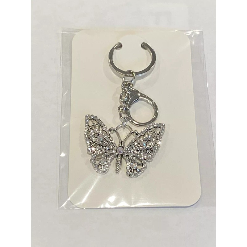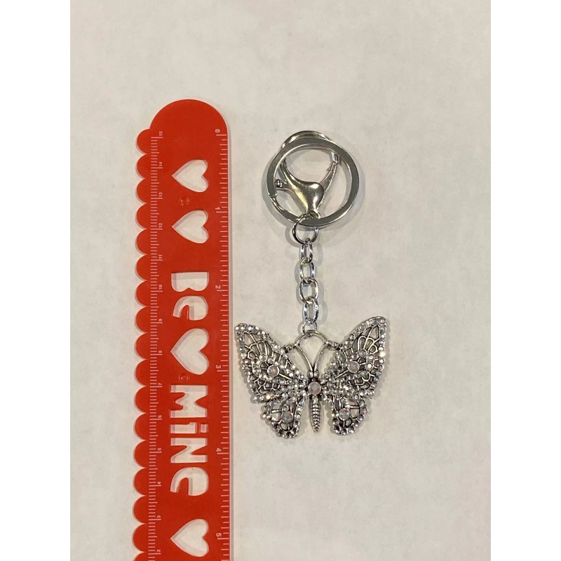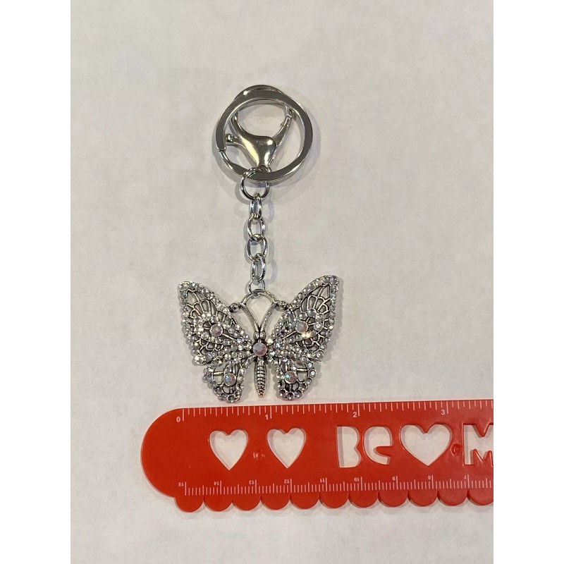 Antique Silver Plated Clear Rhinestone Butterfly Keychain Keyring.