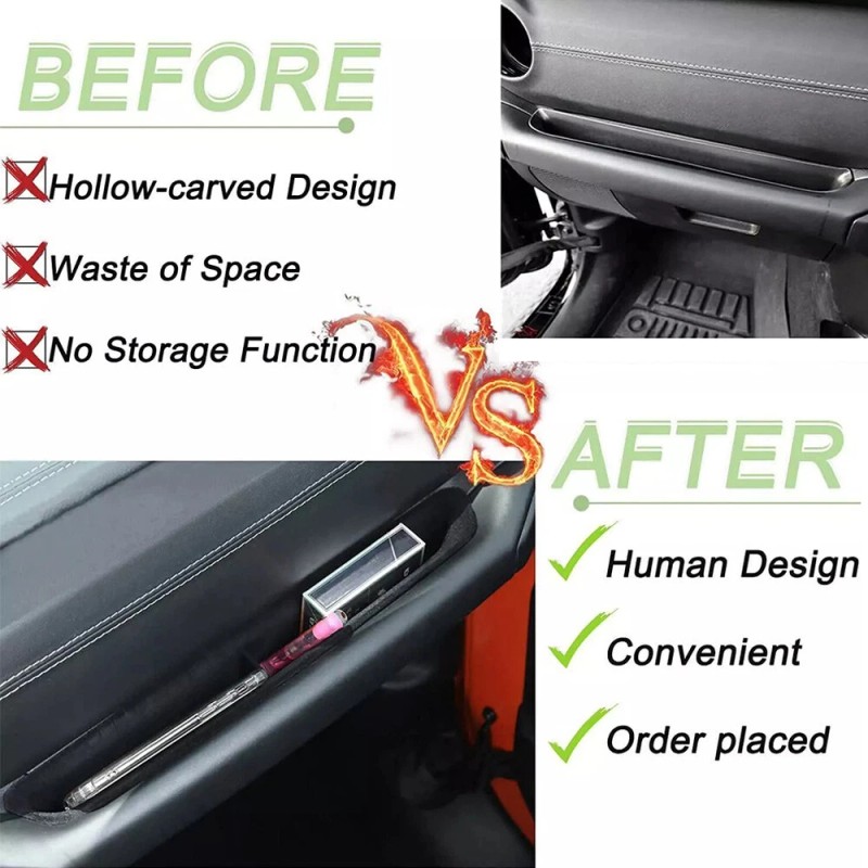 Just put the jeep wrangler storage accessories into the handle slot, it can be perfectly snapped in and won't bounce off. No tape or any tools required.